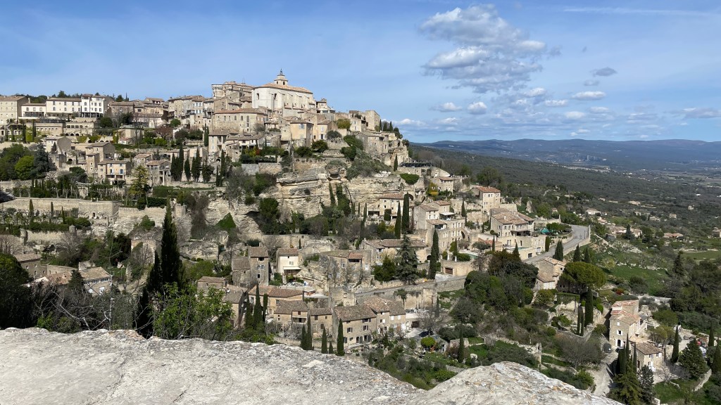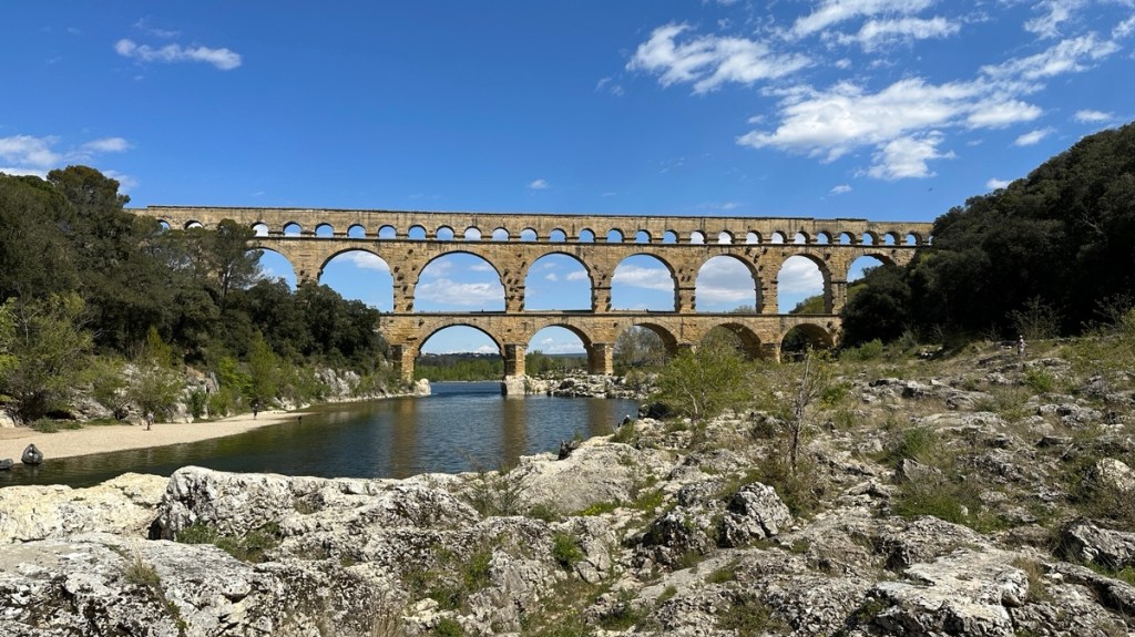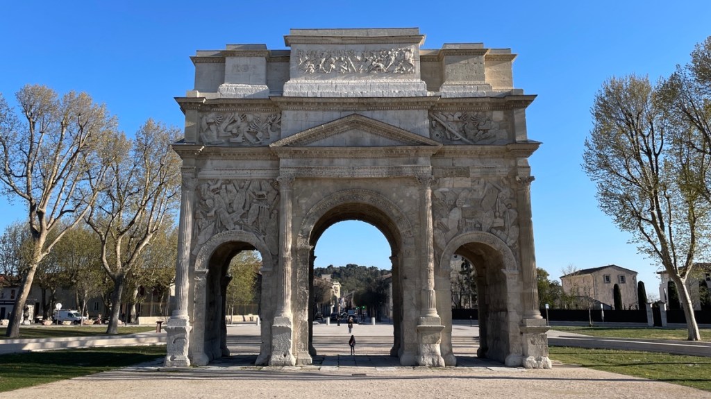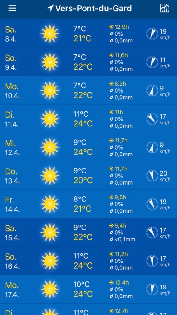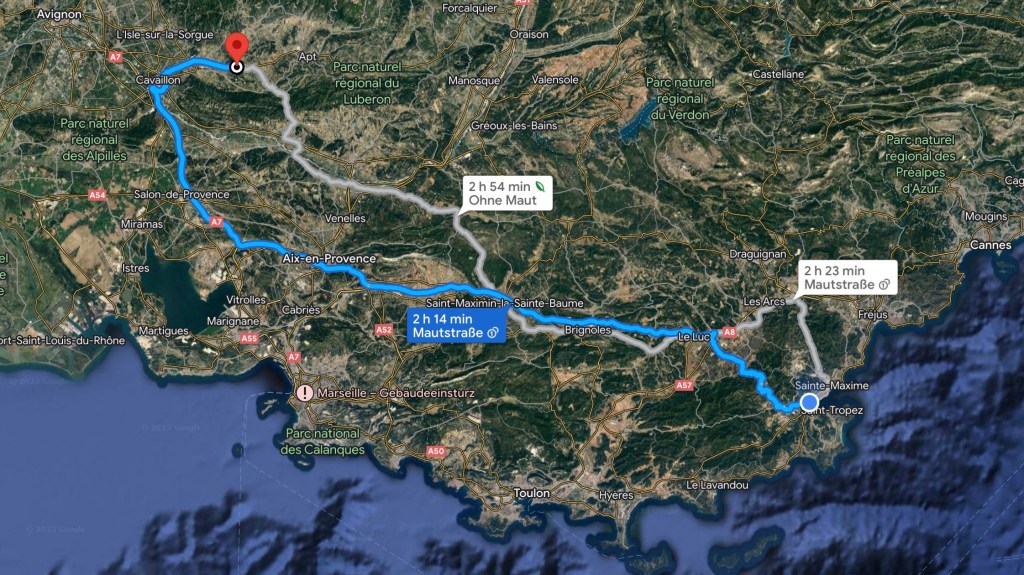 03.04.2023 Gegen 10 Uhr kommen wir los und fahren über Mülhausen und Belfort knapp 500 km bis nach Seurre. Hier waren wir vor einem guten Jahr schon einmal auf Zwischenstopp. Der Ort an der Saône hatte sicher schon einmal bessere Zeiten, aber er gefällt uns irgendwie trotzdem. Ein Besuch im Supermarkt (Saint-Nectaire, Tomme de Savoie und eine Flasche Cidre) rundet den ersten Tag in Frankreich ab.04.04.2023 Vorbei an blühenden Rapsfeldern weht uns der kalte Nordwind Mistral bis nach Orange. Wir finden dort einen guten Campingplatz, beseitigen noch ein paar Spuren des „Shit Storm by Angry Birds“ vom letzten Stellplatz, und dann geht es auch schon auf Stadterkundung in Orange. Die Altstadt bietet viele schöne Details und zeigt uns auf einem Pflasterstein den Kaiser Augustus, in dessen Zeit diese Stadt gegründet wurde. Das römische Theater hat die am besten erhaltene Theaterwand aus der Römerzeit in Europa. Und das triumphbogenartige Ehrenmonument diente vor 2000 Jahren als Stadttor.05.04.2023 Nach einem gemütlichen Start in den Tag besuchen wir nach der Mittagspause das Museum of Art and History hier in Orange. Neben ein paar eindrucksvollen Skulpturen gefallen uns besonders die Fragmente eines einzigartigen Katasters aus der Römerzeit (77 v. Chr.), auf dem für jede Parzelle (750 x 750 m!) die Besitzverhältnisse des Landes, Pacht und Steuer festgehalten waren. Anschließend machen wir mit dem Zug einen Ausflug nach Avignon. Hübsche Straßen, der eher bullige als schöne Papstpalast (inklusive Augmented Reality) und die Brücke von Avignon sind unser Programm. Nach der Rückfahrt und einer Pizza in Orange gibt es noch einen abendlichen Blick auf den Triumphbogen.06.04.2023 Der recht starke Wind der letzten Tage hat sich gelegt, und wir machen heute bei wunderbarem Wetter eine Radtour (knapp 40 km). Es geht eine alte Bahntrasse entlang und dann in die Hügel, in denen sehr viel Wein angebaut wird. Die Kieselsteine sind charakteristisch für dieses Gebiet. In Châteauneuf du Pape genießen wir ein sonniges Mittagessen und besuchen ein Weinmuseum. Die Weinprobe bringt uns die guten Weine näher, aber die Preise (um 40 € pro Flasche!) passen im Preis-Geschmacks-Verhältnis gar nicht zu dem, was wir sonst so genießen. Wir besuchen noch die Ruine des hiesigen Papstpalastes, genießen den Blick auf den hier allgegenwärtigen Mont Ventoux und radeln dann den Weg zurück nach Orange.07.04.2023 Nur knapp 40 km westlich von Orange quartieren wir uns in Remoulins auf dem Camping Car Park ein. Die einfachen Plätze dieser Kette gefallen uns sehr gut. Mit der aufgeladenen Karte öffnet man einfach die Schranke an der Einfahrt und Ausfahrt, abgerechnet wird in der App (hier 13,20 € pro Tag). Sehr empfehlenswert für WoMo-Frankreich-Tourer. Wir laufen von hier nur gut 2 Kilometer zur Pont du Gare, die sich in schönstem Sonnenschein präsentiert … ein Hoch auf die römischen Bauingenieure! Auch das Museum dazu ist sehr informativ. Auf dem Rückweg unserer kleinen Wanderung fotografiert Dagmar noch den Tricolore-Efeu … wir fühlen uns wohl in Frankreich und sind mit der Wetterprognose auch sehr einverstanden 🌞.08.04.2023 An diesem Ostersamstag fahren wir 80 km nach Goult, wieder auf einen Camping Car Park. Nach dem Mittagessen im WoMo nutzen wir einen sehr guten Radweg direkt neben dem Stellplatz, um etwa 12 km über eine Brücke aus der Römerzeit die Hügel hinauf nach Roussillon zu e-radeln. Highlight des Ortes ist der Ockerabbau. Wir besuchen einen Ockersteinbruch und eine alte Fabrik für die Aufbereitung von Ocker. Etwas berauscht von den vielen Farben und Motiven machen wir uns auf den Rückweg.09.04.2023 Unsere heutige Tour de France führt uns 35 km durch die schöne Hügellandschaft zu den sehr touristischen Bergdörfern Gordes und Roussillon, quasi die San Giminianos der Provence. Unsere eBikes und ein Kaltgetränk in einer Brasserie tragen dazu bei, dass wir nicht allzu erschöpft wieder am Wohnmobil ankommen.10.04.2023 Es ist für uns ein ruhiger Ostermontag mit etwas Reiseplanung und Auffrischen der Wassertanks. Wir freuen uns über ein Skype mit unseren Kindern. Am Nachmittag sind wir zunächst in Goult, dem kleinen Ort, zu dem unser Stellplatz gehört. Der hübsche Ort hat eine Windmühle, ein geöffnetes Lebensmittelgeschäft (grüner Spargel!) und eine schöne Aussicht zu bieten. Anschließend fahren wir auf dem Bahntrassenradweg 16 km nach Apt, dem Hauptort des Luberon. Lavendelfelder gibt es am Wegesrand auch, aber sie blühen eben nicht im April … dafür sehen wir aber einige andere Dinge, zum Beispiel kleine Trulli und ein Dolmen (Grab aus der Zeit um etwa 2500 v. Chr.).11.04.2023 Wir fahren ans Meer. Nach einem guten Stück Autobahn wird es im letzten Teil recht bergig und kurvig. Auf dem Camping de la Plage Grimaud finden wir ohne Probleme einen schönen Platz für uns, nur 50 m vom Strand entfernt. Hier ist schon Sommer! Bis auf 27 Grad ist das Thermometer geklettert, und am Strand tummeln sich die Urlauber. Ganz anders als auf dem letzten Stellplatz sind hier mindestens 80 Prozent Deutsche. Wir erkunden die Umgebung, auch das Hafenviertel, das auf dem Plan schon ein bisschen nach Klein-Dubai aussieht.12.04.2023 Heute ist Ruhetag an der Côte d‘Azur. Wir lesen und erholen uns am Wohnmobil … nur die 30 m zum Strandlokal auf dem Platz schaffen wir am Nachmittag.13.04.2023 Nur 20 min zu Fuß und 25 min Bootsfahrt bringen uns nach Saint-Tropéz. Es gibt heute viel Wind und klare Luft. Dem Ort selbst können wir nicht so viel abgewinnen. Aber wir laufen hoch zur Zitadelle, genießen die Aussicht von dort und besichtigen das sehr interessante Marinemuseum darin. Im Ort stehen wir beeinduckt vom Preisniveau vor den Restaurants und Geschäften. Unsere Einkäufe beschränken wir auf ein Baguette und ein Stück Tarte Tropézienne (eine Kreuzung aus Bienenstich und Windbeutel für 9,90 €).14.04.2023 Schon wieder ein ruhiger Tag … Einkauf in der Lagunensta