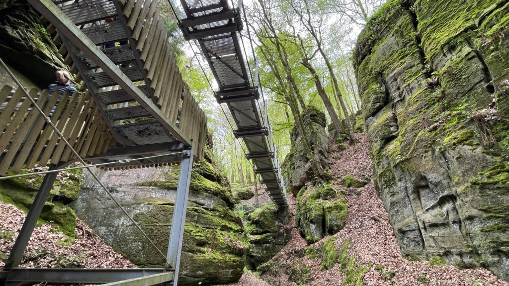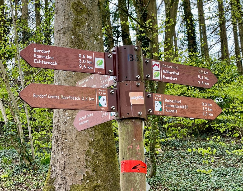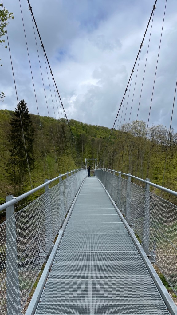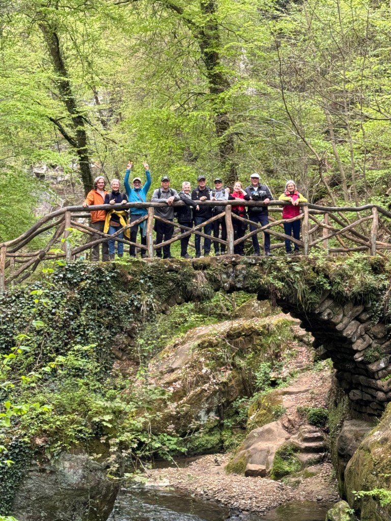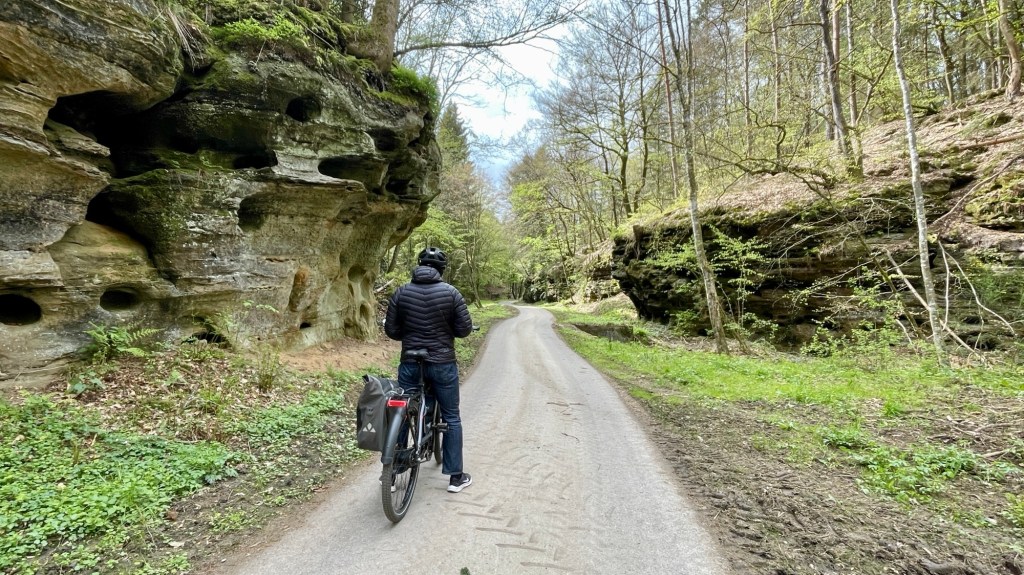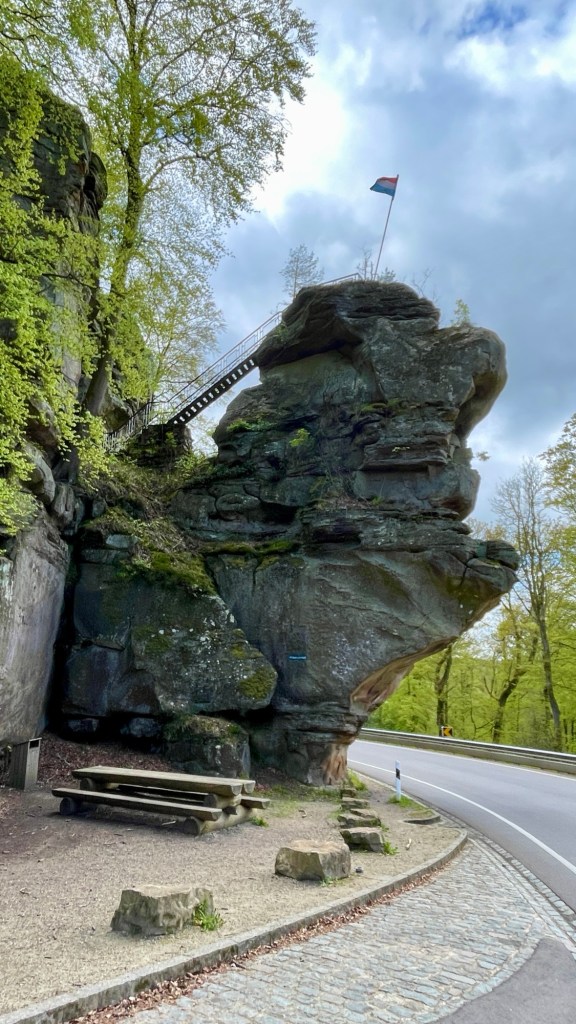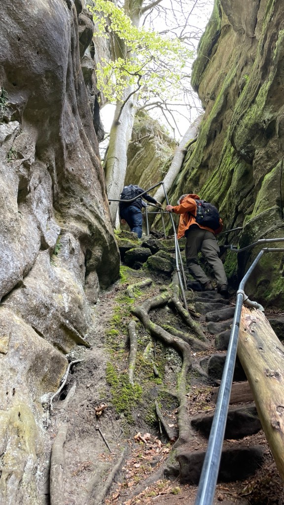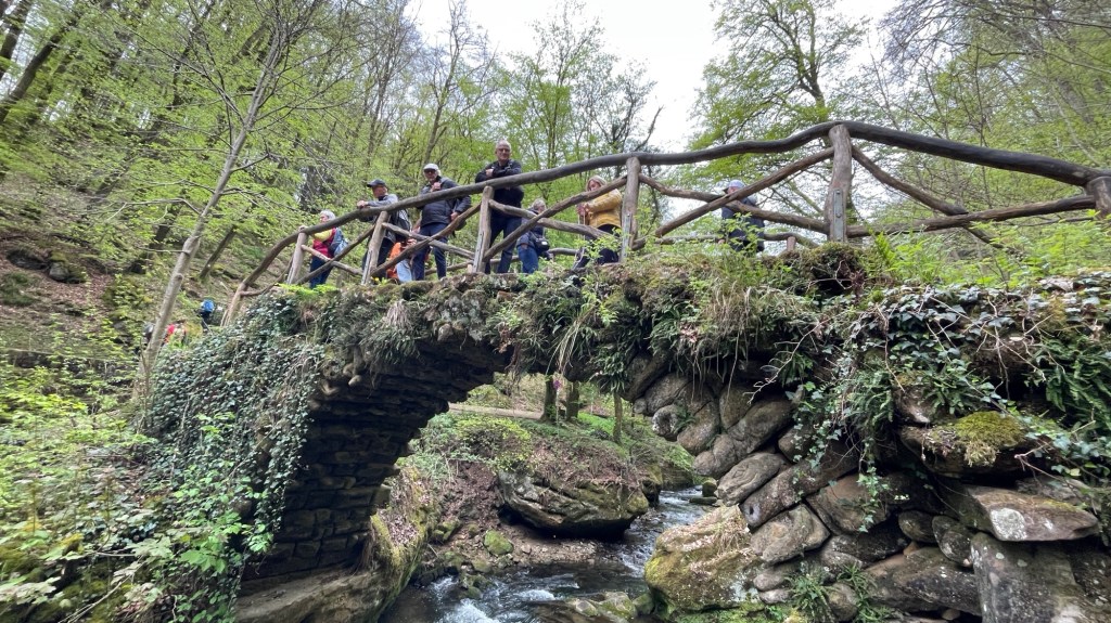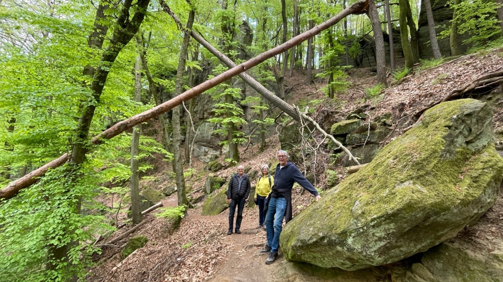 23.4.2024 Diese Reise geht nach Luxemburg, ins schöne Müllerthal. Nach 250 km Fahrt erreichen wir schon vor 13 h den Camping Martbusch in Berdorf. Nach dem Mittagessen geht es gleich los mit den Entdeckungen: Wir erkunden auf dem Wanderweg B2 fantastische Felsformationen ganz nah am Campingplatz, mit Höhlen, Leitern, vielen Steilwänden und Kletternden … Für nur 6 km Wanderweg brauchen wir fast 2 Stunden, aber es ist wirklich eine spektakuläre Landschaft hier mit sooo vielen Wanderwegen! Wir freuen uns auf die nächsten Tage!24.4.2024 Heute folgen wir dem lokalen Wanderweg B5. Es geht wieder durch beeindruckende Felsen und mit Abstechern in Höhlen zum „Predigtstuhl“. Das intensive Grün der Moose gibt dem ganzen Wald ein märchenhaftes Aussehen. Nach dem späten Mittagessen im Wohnmobil machen wir uns noch einmal auf, um den gut 50 m hohen, recht neuen Wasserturm von Berdorf zu besichtigen. Von der Aussichtsterrasse hat man einen guten Blick über Berdorf, und wir sehen uns auch die Ausstellung im Turm zum Thema Wasserwirtschaft an.25.4.2024 Heute fahren wir mit unseren Fahrrädern insgesamt gut 50 km über die Grenze nach Deutschland zu den Irreler Wasserfällen nebst Hängebrücke. Der Radweg, den Outdoor Active dafür vorschlägt, ist perfekt, aber es ist mit 6 bis 8 Grad (zum Glück über Null ❄️💨) so kalt, dass wir mit Mütze unterm Helm und Handschuhen fahren. Auf dem Rückweg machen wir Halt in Echternach, besichtigen dort die romanische Basilika und genießen zum Aufwärmen ein Törtchen in einem Cafe. 26.4.2024 Heute werden die ersten Karlsruher Freunde eintreffen, mit denen wir uns hier verabredet haben. Am Vormittag lassen wir es ruhig angehen. Mittags testen wir dann sorgfältig eine Pizzeria im Ort Berdorf (mit positivem Ergebnis) und reservieren vorsorglich einen Tisch für Samstagabend. Am Nachmittag laufen wir mit Nobs und Monika nochmal die Runde B2 … es gibt wieder viel zu entdecken. Schließlich kommen auch Jutta und Ingo an, und wir verbringen einen schönen Abend zusammen.27.4.2024 Zu sechst machen wir uns auf die Wanderung nach Echternach (Route E1). Es gibt unterwegs wieder viele schöne Eindrücke. Insgesamt kommen aber immerhin 19,5 km zusammen, und wir sind dann doch leicht erschöpft. Am Abend in der Pizzeria vervollständigt sich unsere Gruppe dann auf 10 Personen.28.4.2024 Das Programm für heute ist eine Müllerthal-Highlight-Tour. Mit dem (in Luxemburg kostenlosen) Linienbus fahren wir zu zehnt nach Hersberg und starten dort die Wanderung. Kohlscheuer, Rittergang, Eulenburg, Schiessentümpel, Heringer Millen sind die Namen einiger Highlights entlang der Strecke. Es gilt, enge Felsspalten und finstere Höhlen zu durchqueren. Auch heute sind wir wieder gut 16 km gelaufen und haben uns das Abendessen echt verdient!Schön war‘s! Wir brechen gegen 10 Uhr auf und sind mittags schon wieder zuhause.