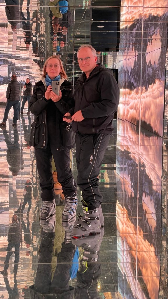 20.2.2024 Wir starten für eine Woche in die Berge und machen auf dem Weg dorthin wieder einmal Halt an der Therme Erding. Es ist auch dieses Mal sehr schön, das warme Wasser und das Hefeweizen in der Poolbar zu genießen!21.2.2024 Über die Inntalautobahn gelangen wir zum Brenner und entrichten dort brav vollelektronisch über die Go-Box unsere Maut. Mittags legen wir eine Rast am Kloster Neustift bei Brixen ein … hier waren wir schon so oft (Manfred zuerst 1970!). Speck, Käse, Vintschgauer … es geht uns gut! Danach ist es nur noch eine gute halbe Stunde Fahrt nach Sankt Vigil. Wir bekommen den erhofften Platz mit Aussicht auf den Ort, genau wie letztes Jahr. Ein kleiner Shopping-Spaziergang, abends eine Pizza im Restaurant am Platz … wir sind voll im Urlaubsmodus …22.2.2024 Nach gemütlichem Start in den Tag gibt es mittags eine Pizza bei „Erika“. Anschließend laufen wir ein paar Kilometer auf einem Winterwanderweg … es hat noch nicht angefangen zu schneien, aber alles ist doch schön winterlich. 23.2.2024 Jetzt ist hier richtig Winter! Es werden über 20 cm Neuschnee erwartet. Am Vormittag stapfen wir einige Zeit durch das Schneetreiben, den Nachmittag genießen wir kuschelig im gut beheizten Wohnmobil. Und abends dann nochmal Pizza … die ist sooo lecker hier!24.2.2024 Heute ist Skitag! Wir haben sogar ein paar Sonnenstunden und können den vielen Neuschnee genießen. Nach einigen Auf- und Abfahrten und einer kleinen Mittags-Einkehr zieht es uns ins „Lumen“, ein Fotografie-Museum in der alten Bergstation auf dem Kronplatz. Es ist definitiv unser erster Museumsbesuch in Skistiefeln! Besonders gefällt uns der Spiegelsaal, der so ungewöhnliche Eindrücke bietet. Den Abend verbringen wir im Wohnmobil bei schönster Aussicht auf Sankt Vigil.25.2.2024 Wir lassen es ruhig angehen an diesem Sonntag. Nach dem Mittagessen laufen wir eine größere Runde durch die schöne Winterlandschaft, und danach schieben wir den Schnee ums Wohnmobil etwas beiseite, damit wir morgen gut ausparken können. Und Dagmar kreiert eine ihrer wunderbaren Schneekatzen.26.2.2024 Die Fahrt von Sankt Vigil über den Brenner nach Söll in Tirol läuft gut, und wir können dort mittags auf dem Camping Franzlhof einchecken. Wir treffen nachmittags Kristina und Elise, und am Abend treffen wir im Hotel Postwirt auch Sebastian, Irmtraut und Gerd. Auf dem Weg dorthin sehen wir noch einen personallosen Container zum Verkauf von regionalen Spezialitäten. Schnee im Tal gibt es hier nicht mehr, aber morgen will Manfred zum Skifahren hinauf auf den Berg.27.2.2024 Es ist ein wunderbarer Skitag für Kristina, Sebastian und Manfred. 14 Liftfahrten, 31 Pistenkilometer, ein Hefeweizen mit wunderbarer Aussicht auf der „Hohen Salve“ und ein Blick auf den „Gruberhof“ bei der Abfahrt … was will man mehr!? Am Abend lassen wir uns dann wieder im Postwirt verwöhnen.28.2.2024 Es sind gut 500 km von Söll nach Trautheim, und nach fast staufreier Fahrt kommen wir gegen 16 Uhr wieder zuhause an.