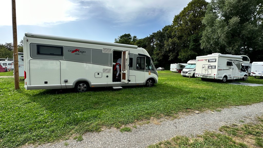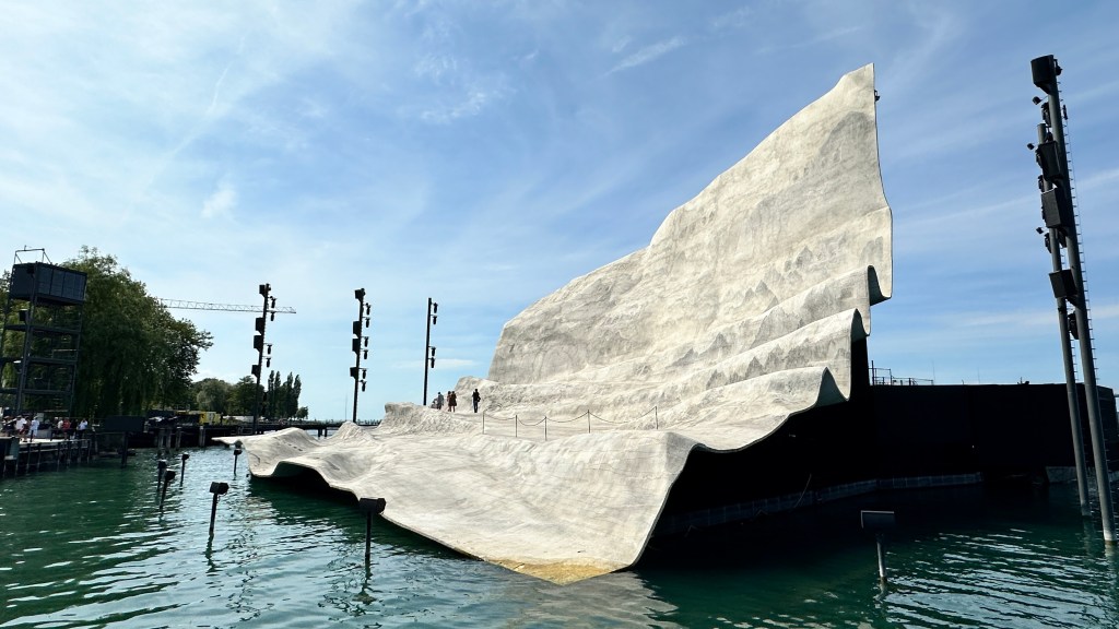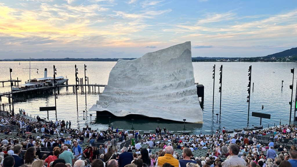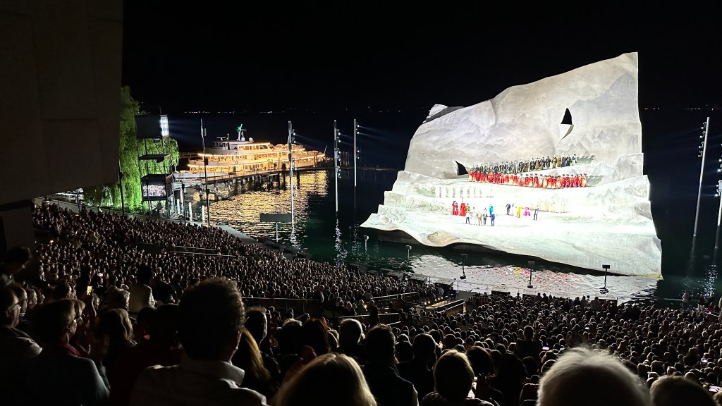 20.07.2023 Die Sonne scheint, und wir erkunden Bregenz zu Fuß. Es gibt viele schöne alte Bauten, besonders in der Oberstadt. Das vom Architekten Zumthor gestaltete Kunsthaus (Minimalismus trifft Lichtregie!) zeigt eine Ausstellung von Kevin Armitage … bunte Bilder prangern Missstände in Kenia an. Auf dem Rückweg zum Campingplatz werfen wir schon mal einen Blick auf die Seebühne, die uns am Abend erwartet. Um 21:15 h beginnt die Saisonpremiere der Puccini-Oper „Madame Butterfly“ … es geht zwar leider wieder nicht gut aus, aber wir sind von der Inszenierung sehr beeindruckt und genießen die wunderschöne Atmosphäre inklusive Seeblick.