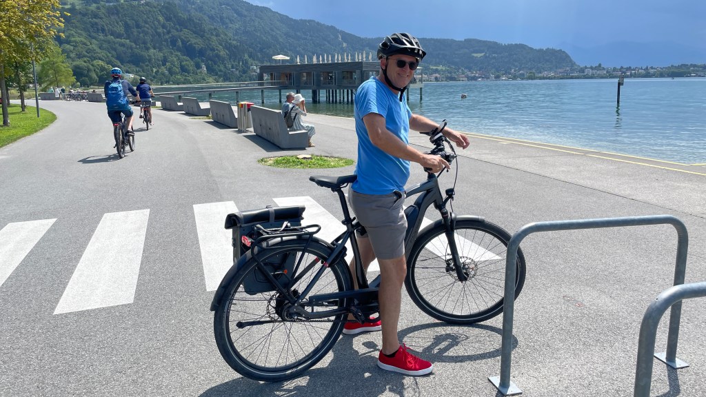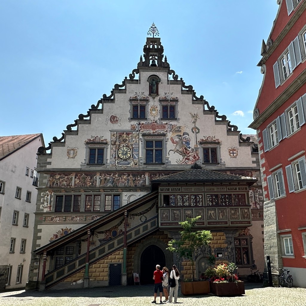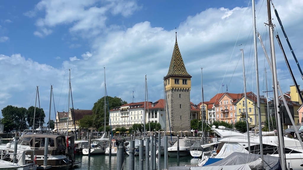 18.07.2023 Eine kurze Reise nach Bregenz … wir haben Karten für Madame Butterfly auf der Seebühne für Donnerstag! Wir kommen nach 5 Stunden Fahrt auf dem Seecamping Bregenz an. Es regnet etwas, aber kurz vor fünf können wir noch einen schönen Rundgang an das Ufer des Bodensees und zur Mündung der Bregenzer Ach machen. Besonders gefiel uns eine Silberweide am Ufer!19.07.2023 Der vorhergesagte Regentag wird super sonnig, und wir radeln auf besten Radwegen am Bodenseeufer entlang und am schönen Mili-Badehaus vorbei zur Lindau-Insel. Der Mangturm aus dem 12. Jh., der (relativ) neue Leuchtturm, die um 1000 erbaute Peterskirche mit ihren Fresken, das barocke Münster, ein prächtiges altes Rathaus und eine schöne Fußgängerzone (mit Zufahrtregelung durch versenkbaren Poller auf öffentlicher Straße) … uns gefällt es hier sehr gut. Am späten Nachmittag nehmen wir an unserem Campingplatz ein Bad im Bodensee (Badeschuhe zu empfehlen). Und am Abend genießen wir ein gutes Essen mit Susanne und Gernot im Klosterkeller Mehrerau.MartinsturmMeißnersteigDas schmalste Haus (57 cm)KunsthausRücken braucht PauseDagmars Traumhaus
