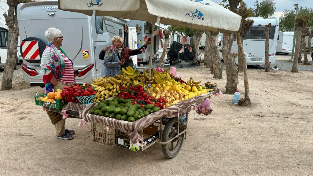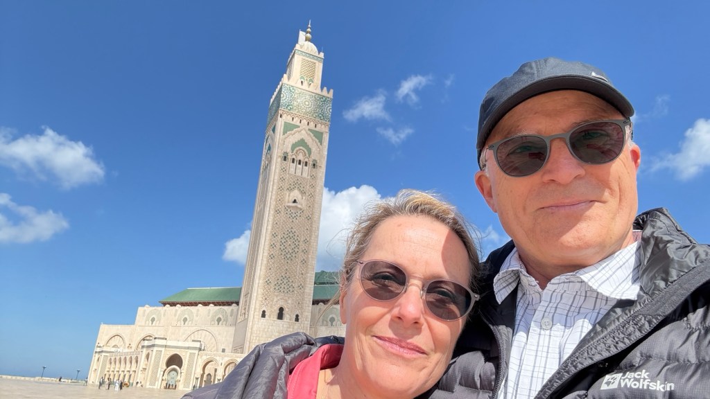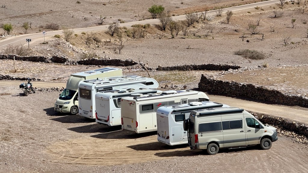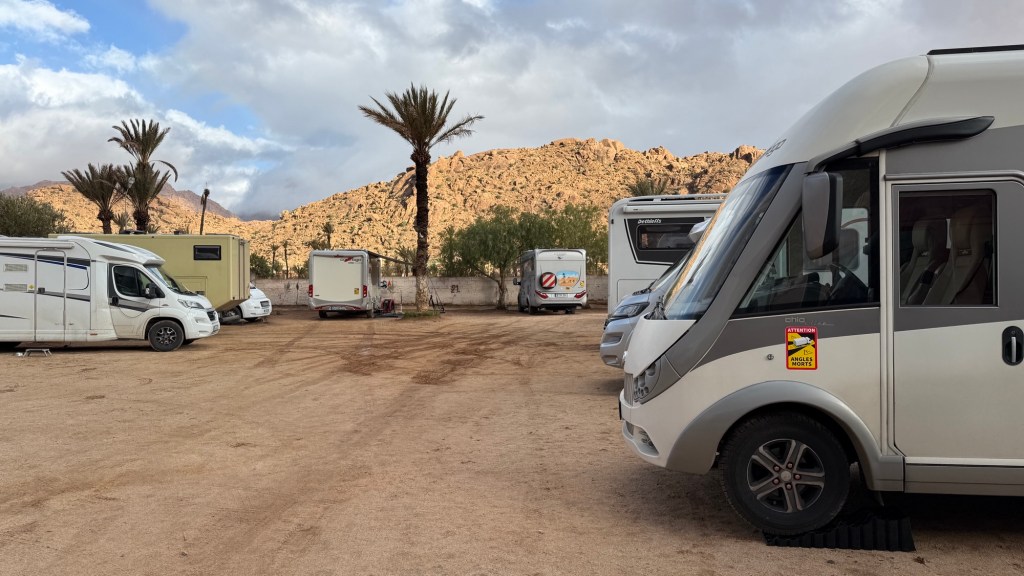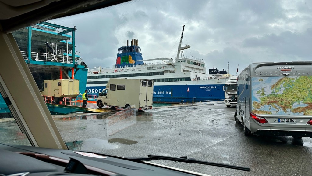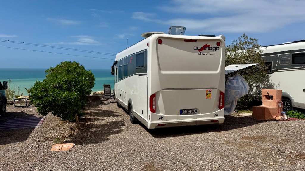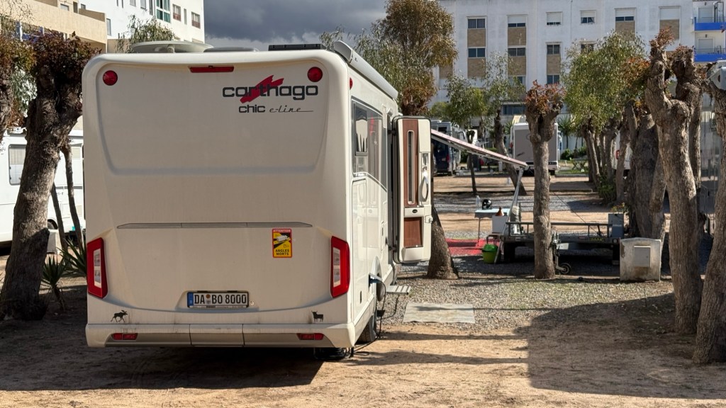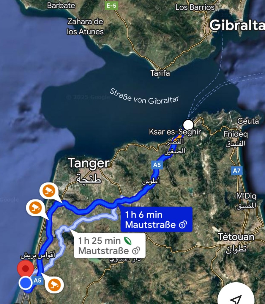 1.3.2025 Nach 300 km (und insgesamt gut 2.500 km) erreichen wir den Treffpunkt der Gruppe für die Marokko-Tour auf dem Campingplatz Valdevaqueros bei Tarifa. Die Stellplätze sind schön, aber durch den Regen der letzten Tage hier sehr matschig. Obwohl die Tour ja erst am nächsten Mittwoch losgeht, sind doch schon einige Teilnehmer hier, und wir hocken zum Kennenlernen schon mal ein paar Stunden vor der Bar des Campingplatzes zusammen. Anschließend machen wir noch einen Strandspaziergang mit Blick auf den afrikanischen Kontinent.2.3.2025 Nach einem ruhigen Vormittag und einer von Dagmar kreierten „Risoella“ (Risotto mit Paella-Reis) laufen wir am Nachmittag zur Duna de Valdevaqueros. Wir besuchen dort den „Hombre de Madera“ (Mann aus Holz), der dem ständigen Wind trotzt und die Aussicht über die Bucht mit vielen Kite-Surfern und den Blick nach Afrika genießt. Anschließend gibt es einen kleinen Umtrunk mit ein paar Mitgliedern der Reisegruppe in der Bar des Campingplatzes.3.3.2025 Angelika und Andreas nehmen uns in ihrem Wohnmobil mit ins 10 km entfernte Tarifa. Zu zweit erkunden wir die Stadt, die aber für uns nicht so viel zu bieten hat. Am besten gefällt uns ein Restaurant am Strand, von dem aus wir den Kite-Surfern bei ihrem spektakulären Treiben zusehen können. Wir gönnen uns für den Rückweg eine Taxifahrt und verbringen den größten Teil des Nachmittags mit der wachsenen Reisegruppe in der Bar des Campingplatzes.4.3.2025 Heute ist der erste Tag unserer gebuchten Marokko-Tour. Vormittags frischen wir alle Wohnmobilsysteme auf. Nachmittags treffen sich alle Teilnehmer, um sich von der Organisatorin Eva in die Tour einstimmen zu lassen. Nach vielen Informationen gibt es dann zur Belohnung Sangria und schließlich eine Riesen-Paella für die 30 Mitreisenden.5.3.2025 Der Wecker klingelt um 7 h, Abfahrt ist um 7:30 h. Wir fahren 45 min zum Hafen von Algeciras, wo wir das Ticket für die „10 h“-Fähre bekommen und uns anstellen. Um 11 h beginnt endlich das Verladen aufs Schiff, kurz nach 12 h fährt das Schiff ab. Nach 90 min, gegen 12:30 h Ortszeit, kommen wir in Tanger Med an und verbringen dann nochmal über 2 Stunden mit Passkontrolle, Zollkontolle und Geldwechsel. Highlight ist das Röntgen der kompletten Fahrzeuge! Nach kurzem Treffen mit der Reiseleitung fahren wir dann noch eine Stunde über die gute Autobahn nach Asilah. Um 16:30 h parken wir auf dem Stellplatz dicht an der Medina ein. Wir machen dort einen Rundgang in der Gruppe und sind schließlich auch beim gemeinsamen Abendessen dabei. Eine laute Sirene kündigt den Sonnenuntergang und das Fastenbrechen an.6.3.2025 Bei Regen brechen wir von Asilah in Richtung Mohammedia auf. Nach 3 Stunden Fahrt über eine moderne Autobahn durch schwer vermüllte Landschaft erreichen wir mittags den am Meer gelegenen Campingplatz „l’Océan Bleu“. Nachmittags erkunden wir ein wenig die Umgebung, abends gehen wir mit der Gruppe in ein Lokal zum „Fastenbrechen“. Ramadan wirkt sich tagsüber schon erheblich aus … viele Geschäfte sind geschlossen, und es ist insgesamt sicher weniger los.7.3.2024 Gegen 8:30 h werden wir abgeholt und mit dem Taxi nach Casablanca gefahren. In der viel zu großen Stadt wollen wir nur die Moschee Hassan II. ansehen 🕌. Sie wurde 1986 bis 1993 erbaut und ist eine der größten Moscheen der Welt, das Minarett ist ca. 200 m hoch. Besonderheit ist auch, dass eine Besichtigung für Nicht-Muslime möglich ist. Uns gefallen auch die vielen schönen Details sehr gut. Am Nachmittag machen wir noch einen kleinen Einkauf auf dem Markt, und am frühen Abend gibt es einen „Stuhlkreis“ der Reisegruppe, wo wir über die Weiterfahrt nach Marrakesch und den Aufenthalt dort informiert werden.8.3.2025 Bei sehr heftigem Regen machen wir uns auf den Weg über die Autobahn nach Marrakesch. Nach 280 km parken wir auf einem großen Parkplatz unmittelbar außerhalb der Stadtmauer ein. Es ist auch am Nachmittag regnerisch und mit gerade 15 Grad viel zu kühl für diese Stadt. Trotzdem sind wir besonders von den Souks mit ihrem bunten Treiben fasziniert. Wir besichtigen auch eine Koranschule aus dem 14. Jahrhundert. Abends gehen wir in einer kleineren Gruppe nochmal los zum Essen. Gerade der große, berühmte Platz „Jemaa el fna“ ist trotz der Nässe und Kälte gut bevölkert. Obststände, Garküchen, Märchenerzähler … alle sind da, nur die Schlangenbeschwörer fehlen, weil es den Kobras offensichtlich zu kalt ist.9.3.2025 Dieser Sonntag hat deutlich besseres Wetter und beginnt um 9:15 h mit einer Lagebesprechung auf dem Wohnmobil-Parkplatz. Anschließend führt uns Mustafa in perfektem Deutsch durch die Medina und die weitläufigen Souks. Es ist alles so bunt und vielfältig! Bei einem Händler für Gewürze und bei einem für Gebäck kaufen wir kräftig ein. Auf dem Rooftop des „Café de France“, das trotz Ramadan für Touristen geöffnet hat, gibt es eine Tajine zum Mittag. Um 15 h haben wir Tickets für den überfüllten „Jardin Majorelle“. Es ist ein schöner, 100 Jahre alter Künstlergarten, der ab 1980 von Yves Saint Laurent und seinem Freund genutzt wurde. Es gibt hier so viele schöne Fotomotive, dass Dagmar die Auswahl wirklich schwer fällt. Den Abend verbringen wir dann zunächst mit der Gruppe in einer Garküche auf dem „Jemaa el fna“ und dann mit Angelika und Andreas bei einem Umtrunk im kleinen Kreis.10.3.2025 Für die 180 km von Marrakesch an die Küste zum Campingplatz „Sidi Kaouki Beach“ brauchen wir gut 3 Stunden … insbesondere in den Ortsdurchfahrten merken wir, dass wir nun wirklich in Marokko sind! Der Stellplatz ist gut, auch wenn wir hier nun zwei weitere Tage keinen funktionierenden Stromanschluss haben … wir freuen uns über die kleine PV-Anlage auf unserem Dach. Wir vertilgen das sehr leckere Gebäck, das wir in Marrakesch gekauft hatten. Nachmittags erkunden wir dann den breiten Sandstrand, der aber ziemlich vermüllt ist. Die vielen herumstehen
