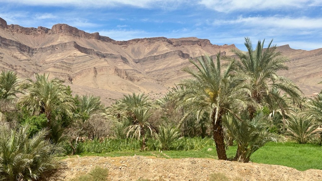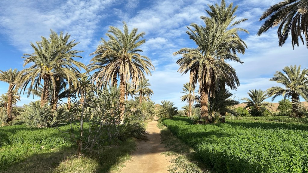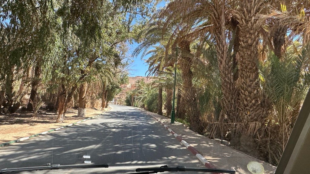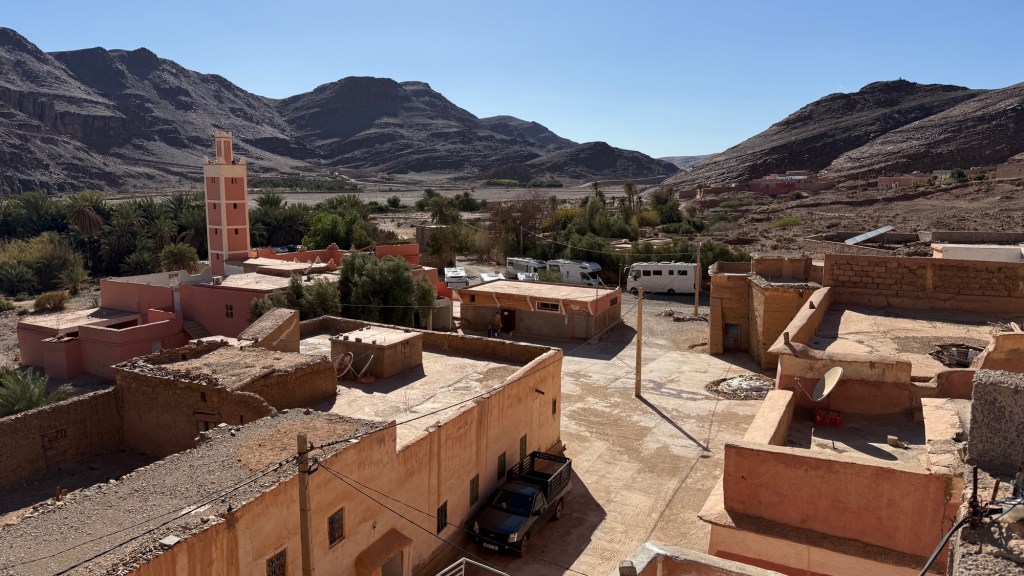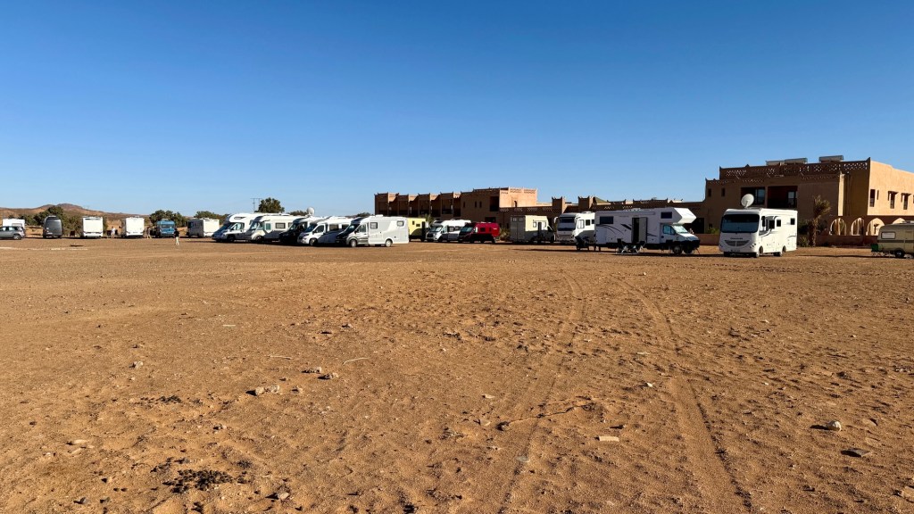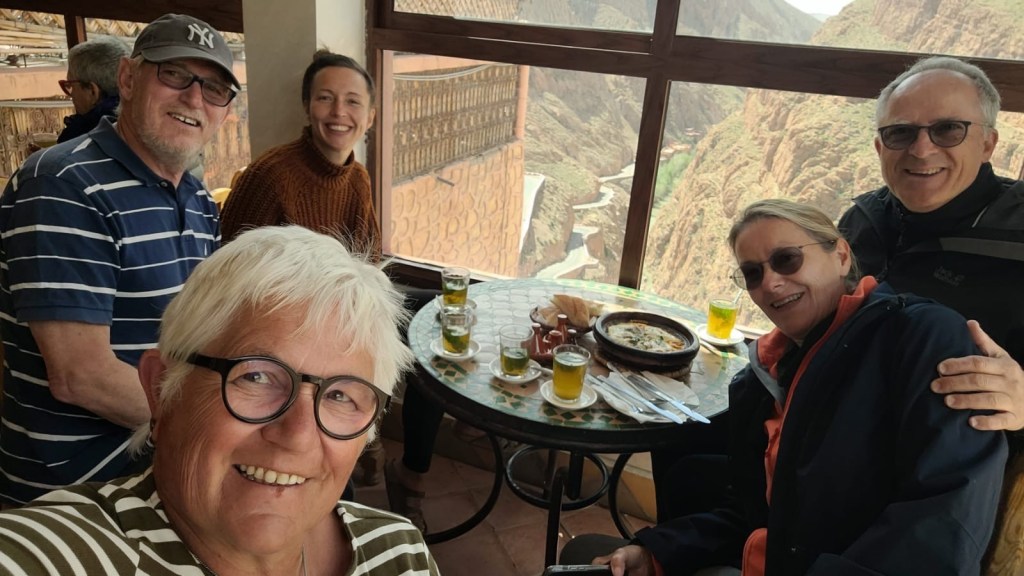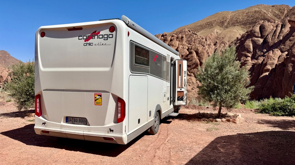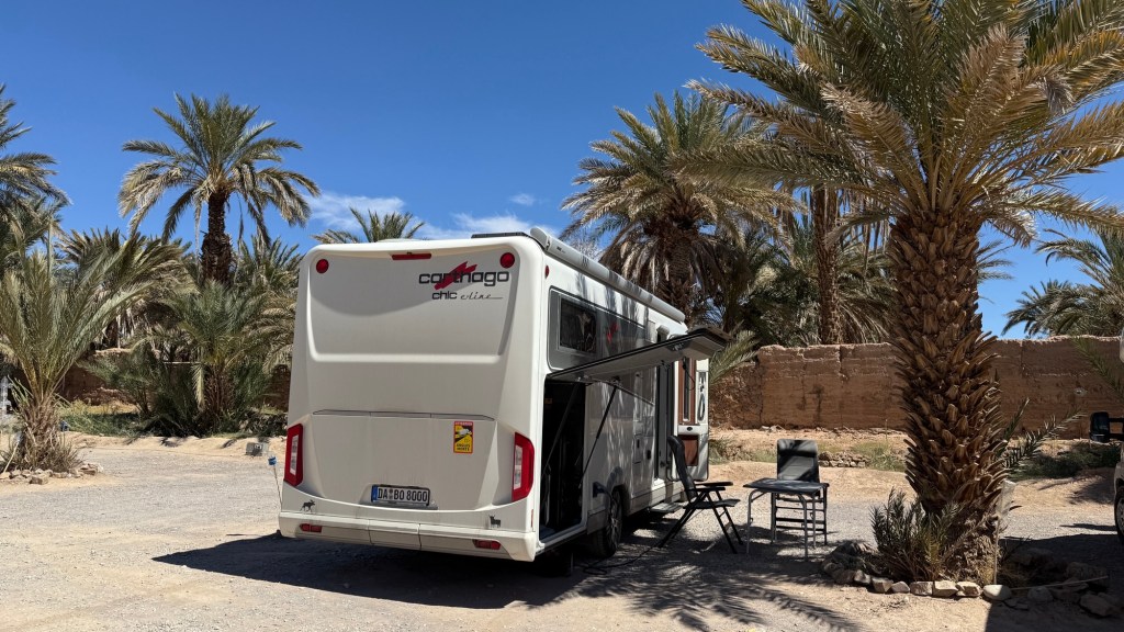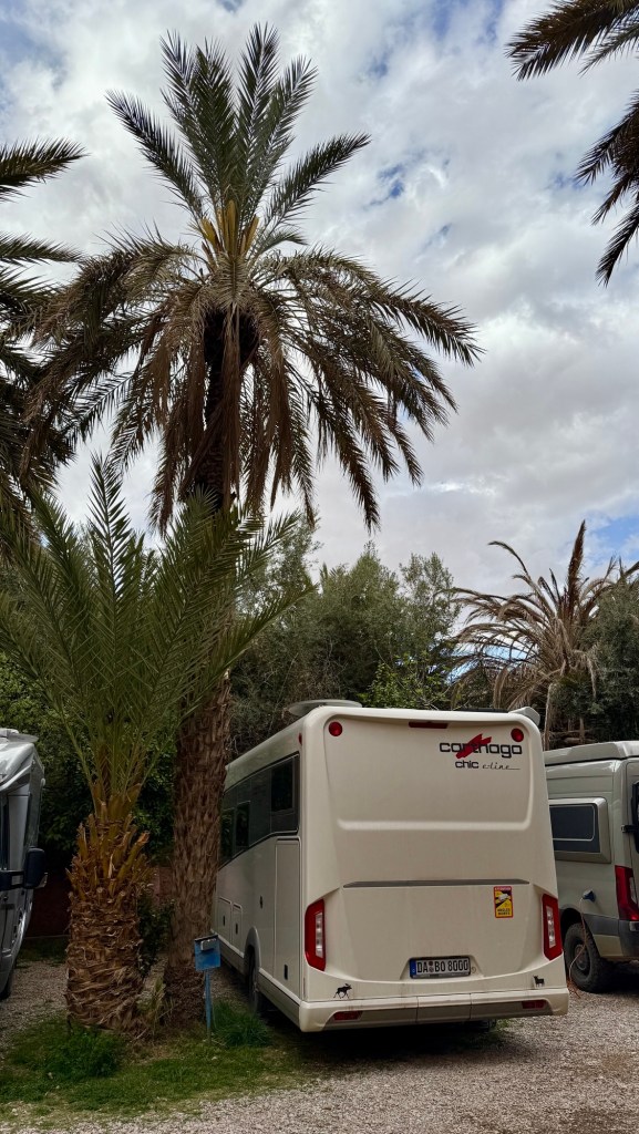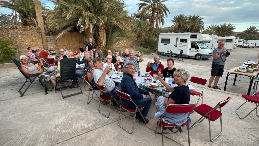 21.3.2025 Am Morgen ziehen wir von unserem Wüstenlager um auf den nahe gelegenen Campingplatz „Auberge El Khaima“ in Mhamid, wo wir sogar einen roten Teppich vors Wohnmobil gelegt bekommen. Um 10 h startet eine Jeep-Tour (genau genommen eine Toyota-Tour) in die Wüste bei Mhamid el Ghizlane. Wir werden in der endlosen Landschaft insgesamt mehr als 100 km durchgerüttelt und besuchen einige Nomaden. Diese sind auf unseren Besuch bestens vorbereitet. Sie verkaufen Souvenirs, bieten Tee an und zeigen uns ihre interessante Art, mit einfachsten Mitteln Brot zu backen. An den größeren Sanddünen, die wir mittags erreichen, ist alles für ein gutes Essen bereit, und auf dem Rückweg lassen sich dann auch noch die Dromedare bereitwillig fotografieren. Leicht erschöpft und verstaubt vom Tourismusprogramm sind wir gegen 17 h zurück auf dem Campingplatz.22.3.2025 Vormittags fahren wir auf guten Straßen und durch beeindruckende Landschaften knapp 200 km nach Agdz. Dabei führt uns die zweite Hälfte des Weges durch das schöne Draa-Tal mit seinen vielen Dattel-Palmen und kargen Bergen. Wir verbringen auf dem Campingplatz „Maison Tensift“ (mit Oasengarten) einen ruhigen Nachmittag. Nach der Reisebesprechung am frühen Abend gibt es im Restaurant des Platzes eine leckere Tajine, dieses Mal mit Hackfleischbällchen. Manfred überredet noch einen marokkanischen Bediensteten dazu, uns eine Flasche Weißwein zu besorgen … der Preis war allerdings mit „Ramadan-Zuschlag“ recht hoch. Den kostbaren Tropfen genießen wir zu sechst diskret in unserem Wohnmobil.„Buttered Camel with Biryani“„Nougat Frozen Candied Fruit Almond“23.3.2025 Insgesamt fahren wir heute 150 km durch die Berglandschaft. In Taznakht machen wir Halt, um etwas über die Teppichproduktion in Marokko zu erfahren … natürlich inklusive Kaufgelegenheit (die wir aber nicht nutzen). Mit schönen Blicken auf die schneebedeckten Berge des Hohen Atlas geht es anschließend weiter nach Ait Ben Haddou, wo wir bei starkem Wind Quartier auf einem einfachen Stellplatz beziehen. Am Nachmittag besichtigen wir das hiesige Lehmdorf, das als Unesco-Weltkulturerbe ein touristischer Hotspot in Marokko ist. Der Wind mausert sich zum Sturm, der Sandwolken durch die Landschaft treibt und unsere Besichtigung etwas ungemütlich macht. Den stürmischen Abend verbringen wir in der inzwischen etablierten Sechserrunde (mit Angelika, Andreas, Sigrid und Gerd) im Restaurant „Tanmirt“, wo wir das bisher mit Abstand beste Essen dieser Reise bekommen!24.3.2025 Parallel zur schneebedeckten Bergkette des Hohen Atlas fahren wir 160 km in die Dades-Schlucht, vorbei an kunstvoll beladenen Lkw und Minaretten mit Storchennestern. In der beeindruckenden Schlucht gibt es viele Hotels und Campingplätze, und unsere Gruppe bekommt ein Quartier am „Hotel Majorel“ mit bester Aussicht. Am Nachmittag wandern wir durch die wunderbar grüne Talsohle und erkunden den Canyon eines trockenen Nebenarms des Dades. Vom Wohnmobil aus haben wir einen wunderbaren Blick auf die sonnenbeschienenen Berge. Es wird ein schöner Abend bei unseren Nachbarn, deren Weinvorräte unerschöpflich sind. Das alles wird nur getrübt dadurch, dass Dagmar beim Zurückgehen einen der vorm Nachbar-WoMo abgestellten Schuhe vermisst …25.3.2025 In der Nacht ist es windig und kalt (wir sind auf 1670 m Höhe), es regnet und gewittert sogar. Am Morgen scheint dann aber wieder die Sonne, und Dagmar kann auch gleich den Schuhklau-Übeltäter samt seiner Beute stellen. Wir beschließen, für die weitere Erkundung der Dades-Schlucht unser Wohnmobil zu schonen und stattdessen mit den eBikes zu fahren. Bei mäßigem Autoverkehr radeln wir auch die wunderbaren Serpentinen hinauf und genießen die Aussicht. Noch etwas weiter im Tal (nach 16 km) erreichen wir die engste Stelle, an der sich größere Fahrzeuge aneinander vorbei mühen. Auf dem Rückweg genießen wir marokkanischen Pfefferminztee und bekommen auch eine Tajine mit Gemüse und Ei als spätes Frühstück. Zurück am Wohnmobil geht es dann nur gut 70 km weiter in die Todra-Schlucht, wo unsere Gruppe einmal mehr auf dem „Auberge Camping Atlas“ unter Palmen steht.26.3.2025 Heute ist „Ruhetag“, und wir fahren nicht weiter. Der Pool des Stellplatzes wirkt in der Sonne zwar verlockend, aber es sind trotzdem nur 15 Grad Lufttemperatur. Nach umfassender Abwägung verzichten wir auf das kühle Bad. Stattdessen queren wir zu Fuß das Flüsschen Todra, um dort den Oasengarten mit seinen Wasserrinnen, Dattelpalmen und etwas Landwirtschaft zu erkunden. Nachmittags machen wir noch eine kleine Radtour. Nur gut 5 km entfernt befindet sich die bekannte Engstelle der Todra-Schlucht mit bis zu 300 m hohen Steilwänden … ein Paradies für Kletterer.27.3.2025 Bereits um halb neun starten wir unsere Fahrt über gut 200 km in Richtung Erg Chebbi. Erster Halt ist das Berber-Museum in Tinejdad, wo wir viel über die Berber-Kultur erfahren. Dort gibt es auch Erklärungen zu den Khettaras, die wir uns beim zweiten Stopp ansehen. Es sind unterirdische Wasserkanäle, mit denen die Grundwasserschicht „angezapft“ wurde und dann das Wasser mit geringem Gefälle in Richtung einer Talsohle bis zur Oberfläche geleitet wurde. „Maulwurfshügel“ an der Oberfläche lassen den Verlauf gut erkennen. Nach einer Wüstenpizza und einem Dattel-Großeinkauf in Rissani fahren wir (ausnahmsweise im Konvoi) zum Hotel „Nomad Palace“ in Merzouga. Wir sind dort nah an den Sanddünen und lassen uns auf einen Dromedarritt ein. Mit sanftem Geschaukel geht es in die Dünen, um dort den Sonnenuntergang zu beobachten. Auch wenn das hier alles sehr „touristifiziert“ ist: Wir haben viel Spaß, und es ist ein schönes Erlebnis!28.3.2025 Auf dem Weg über gut 200 km in Ziz-Tal besuchen wir eine Fossilien-Schleiferei. Wir sind von der Auswahl und besonders von den großen Objekten sehr beeindruckt. Vom Stellplatz „Jurassic“ aus macht Dagmar am Nachmittag eine Wande