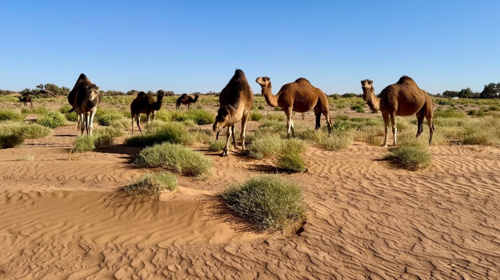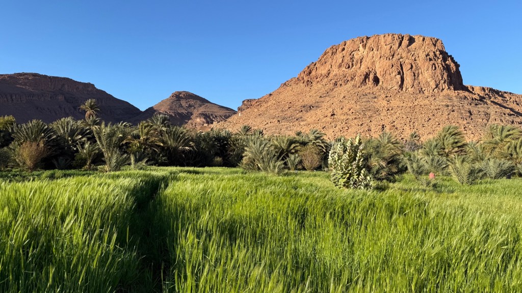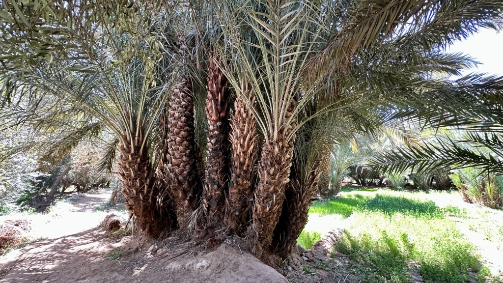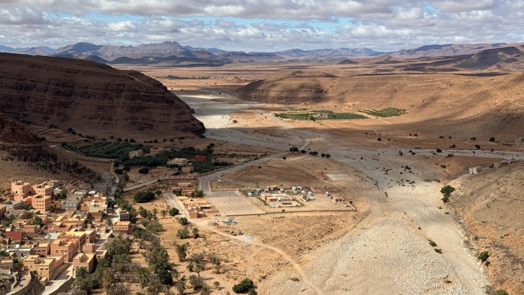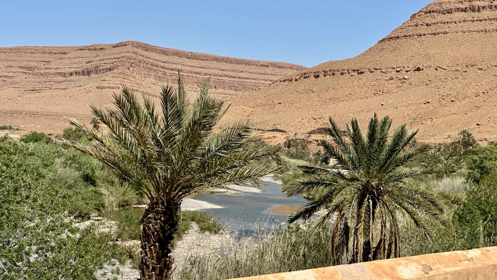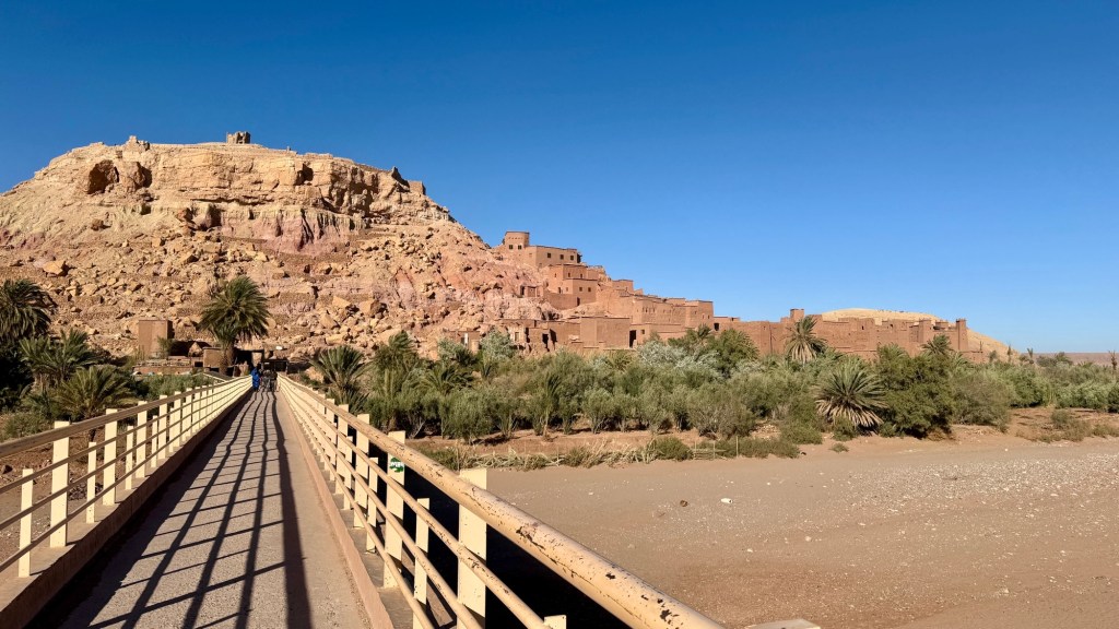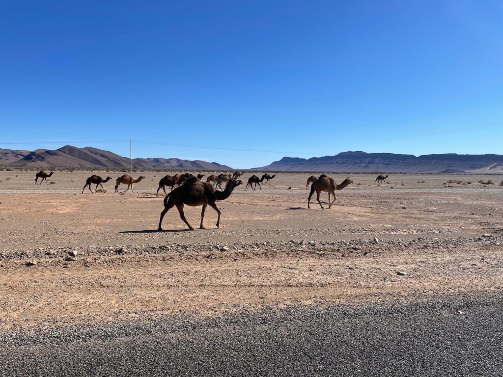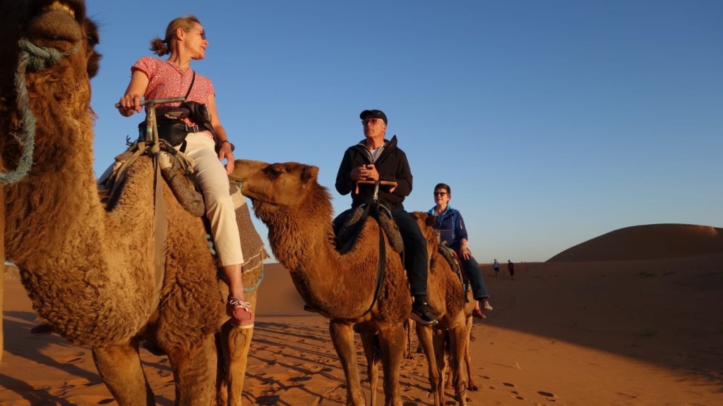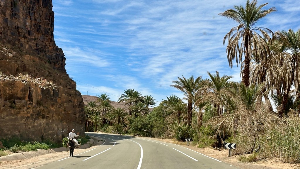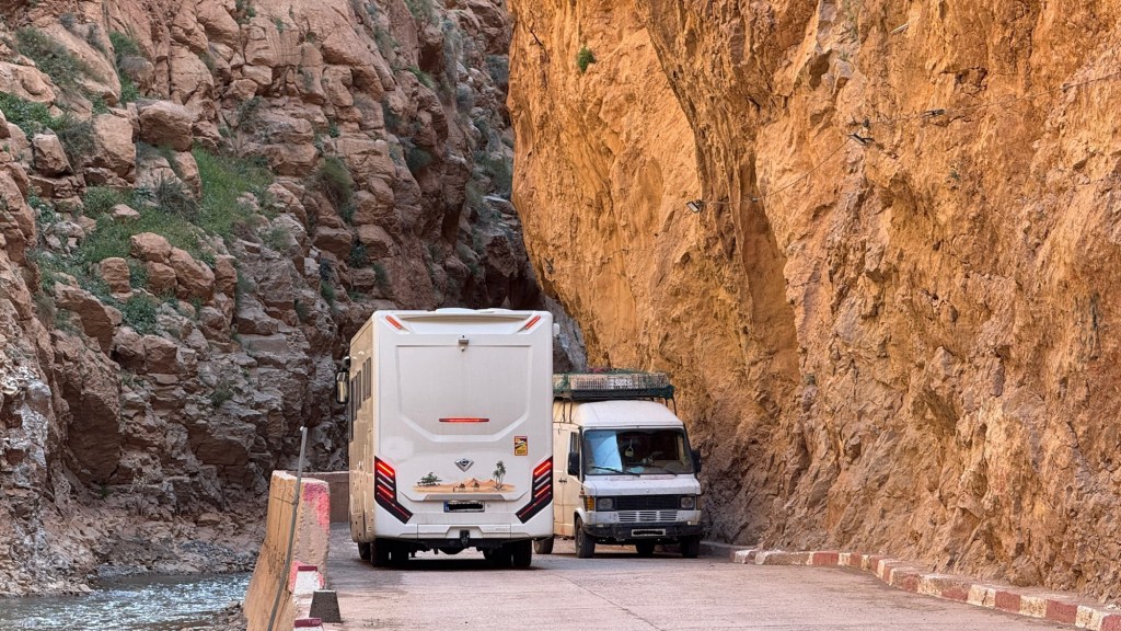 21.3.2025 Am Morgen ziehen wir von unserem Wüstenlager um auf den nahe gelegenen Campingplatz „Auberge El Khaima“ in Mhamid, wo wir sogar einen roten Teppich vors Wohnmobil gelegt bekommen. Um 10 h startet eine Jeep-Tour (genau genommen eine Toyota-Tour) in die Wüste bei Mhamid el Ghizlane. Wir werden in der endlosen Landschaft insgesamt mehr als 100 km durchgerüttelt und besuchen einige Nomaden. Diese sind auf unseren Besuch bestens vorbereitet. Sie verkaufen Souvenirs, bieten Tee an und zeigen uns ihre interessante Art, mit einfachsten Mitteln Brot zu backen. An den größeren Sanddünen, die wir mittags erreichen, ist alles für ein gutes Essen bereit, und auf dem Rückweg lassen sich dann auch noch die Dromedare bereitwillig fotografieren. Leicht erschöpft und verstaubt vom Tourismusprogramm sind wir gegen 17 h zurück auf dem Campingplatz.22.3.2025 Vormittags fahren wir auf guten Straßen und durch beeindruckende Landschaften knapp 200 km nach Agdz. Dabei führt uns die zweite Hälfte des Weges durch das schöne Draa-Tal mit seinen vielen Dattel-Palmen und kargen Bergen. Wir verbringen auf dem Campingplatz „Maison Tensift“ (mit Oasengarten) einen ruhigen Nachmittag. Nach der Reisebesprechung am frühen Abend gibt es im Restaurant des Platzes eine leckere Tajine, dieses Mal mit Hackfleischbällchen. Manfred überredet noch einen marokkanischen Bediensteten dazu, uns eine Flasche Weißwein zu besorgen … der Preis war allerdings mit „Ramadan-Zuschlag“ recht hoch. Den kostbaren Tropfen genießen wir zu sechst diskret in unserem Wohnmobil.„Buttered Camel with Biryani“„Nougat Frozen Candied Fruit Almond“23.3.2025 Insgesamt fahren wir heute 150 km durch die Berglandschaft. In Taznakht machen wir Halt, um etwas über die Teppichproduktion in Marokko zu erfahren … natürlich inklusive Kaufgelegenheit (die wir aber nicht nutzen). Mit schönen Blicken auf die schneebedeckten Berge des Hohen Atlas geht es anschließend weiter nach Ait Ben Haddou, wo wir bei starkem Wind Quartier auf einem einfachen Stellplatz beziehen. Am Nachmittag besichtigen wir das hiesige Lehmdorf, das als Unesco-Weltkulturerbe ein touristischer Hotspot in Marokko ist. Der Wind mausert sich zum Sturm, der Sandwolken durch die Landschaft treibt und unsere Besichtigung etwas ungemütlich macht. Den stürmischen Abend verbringen wir in der inzwischen etablierten Sechserrunde (mit Angelika, Andreas, Sigrid und Gerd) im Restaurant „Tanmirt“, wo wir das bisher mit Abstand beste Essen dieser Reise bekommen!24.3.2025 Parallel zur schneebedeckten Bergkette des Hohen Atlas fahren wir 160 km in die Dades-Schlucht, vorbei an kunstvoll beladenen Lkw und Minaretten mit Storchennestern. In der beeindruckenden Schlucht gibt es viele Hotels und Campingplätze, und unsere Gruppe bekommt ein Quartier am „Hotel Majorel“ mit bester Aussicht. Am Nachmittag wandern wir durch die wunderbar grüne Talsohle und erkunden den Canyon eines trockenen Nebenarms des Dades. Vom Wohnmobil aus haben wir einen wunderbaren Blick auf die sonnenbeschienenen Berge. Es wird ein schöner Abend bei unseren Nachbarn, deren Weinvorräte unerschöpflich sind. Das alles wird nur getrübt dadurch, dass Dagmar beim Zurückgehen einen der vorm Nachbar-WoMo abgestellten Schuhe vermisst …25.3.2025 In der Nacht ist es windig und kalt (wir sind auf 1670 m Höhe), es regnet und gewittert sogar. Am Morgen scheint dann aber wieder die Sonne, und Dagmar kann auch gleich den Schuhklau-Übeltäter samt seiner Beute stellen. Wir beschließen, für die weitere Erkundung der Dades-Schlucht unser Wohnmobil zu schonen und stattdessen mit den eBikes zu fahren. Bei mäßigem Autoverkehr radeln wir auch die wunderbaren Serpentinen hinauf und genießen die Aussicht. Noch etwas weiter im Tal (nach 16 km) erreichen wir die engste Stelle, an der sich größere Fahrzeuge aneinander vorbei mühen. Auf dem Rückweg genießen wir marokkanischen Pfefferminztee und bekommen auch eine Tajine mit Gemüse und Ei als spätes Frühstück. Zurück am Wohnmobil geht es dann nur gut 70 km weiter in die Todra-Schlucht, wo unsere Gruppe einmal mehr auf dem „Auberge Camping Atlas“ unter Palmen steht.26.3.2025 Heute ist „Ruhetag“, und wir fahren nicht weiter. Der Pool des Stellplatzes wirkt in der Sonne zwar verlockend, aber es sind trotzdem nur 15 Grad Lufttemperatur. Nach umfassender Abwägung verzichten wir auf das kühle Bad. Stattdessen queren wir zu Fuß das Flüsschen Todra, um dort den Oasengarten mit seinen Wasserrinnen, Dattelpalmen und etwas Landwirtschaft zu erkunden. Nachmittags machen wir noch eine kleine Radtour. Nur gut 5 km entfernt befindet sich die bekannte Engstelle der Todra-Schlucht mit bis zu 300 m hohen Steilwänden … ein Paradies für Kletterer.27.3.2025 Bereits um halb neun starten wir unsere Fahrt über gut 200 km in Richtung Erg Chebbi. Erster Halt ist das Berber-Museum in Tinejdad, wo wir viel über die Berber-Kultur erfahren. Dort gibt es auch Erklärungen zu den Khettaras, die wir uns beim zweiten Stopp ansehen. Es sind unterirdische Wasserkanäle, mit denen die Grundwasserschicht „angezapft“ wurde und dann das Wasser mit geringem Gefälle in Richtung einer Talsohle bis zur Oberfläche geleitet wurde. „Maulwurfshügel“ an der Oberfläche lassen den Verlauf gut erkennen. Nach einer Wüstenpizza und einem Dattel-Großeinkauf in Rissani fahren wir (ausnahmsweise im Konvoi) zum Hotel „Nomad Palace“ in Merzouga. Wir sind dort nah an den Sanddünen und lassen uns auf einen Dromedarritt ein. Mit sanftem Geschaukel geht es in die Dünen, um dort den Sonnenuntergang zu beobachten. Auch wenn das hier alles sehr „touristifiziert“ ist: Wir haben viel Spaß, und es ist ein schönes Erlebnis!28.3.2025 Auf dem Weg über gut 200 km in Ziz-Tal besuchen wir eine Fossilien-Schleiferei. Wir sind von der Auswahl und besonders von den großen Objekten sehr beeindruckt. Vom Stellplatz „Jurassic“ aus macht Dagmar am Nachmittag eine Wande