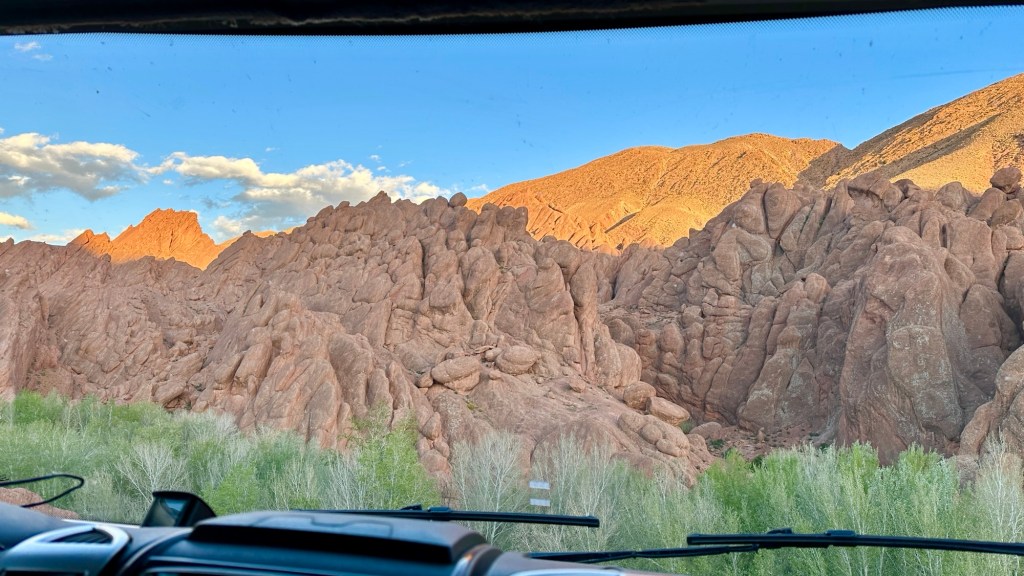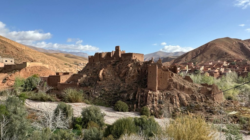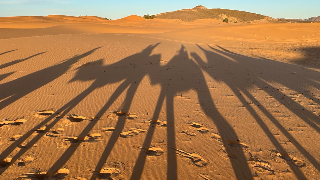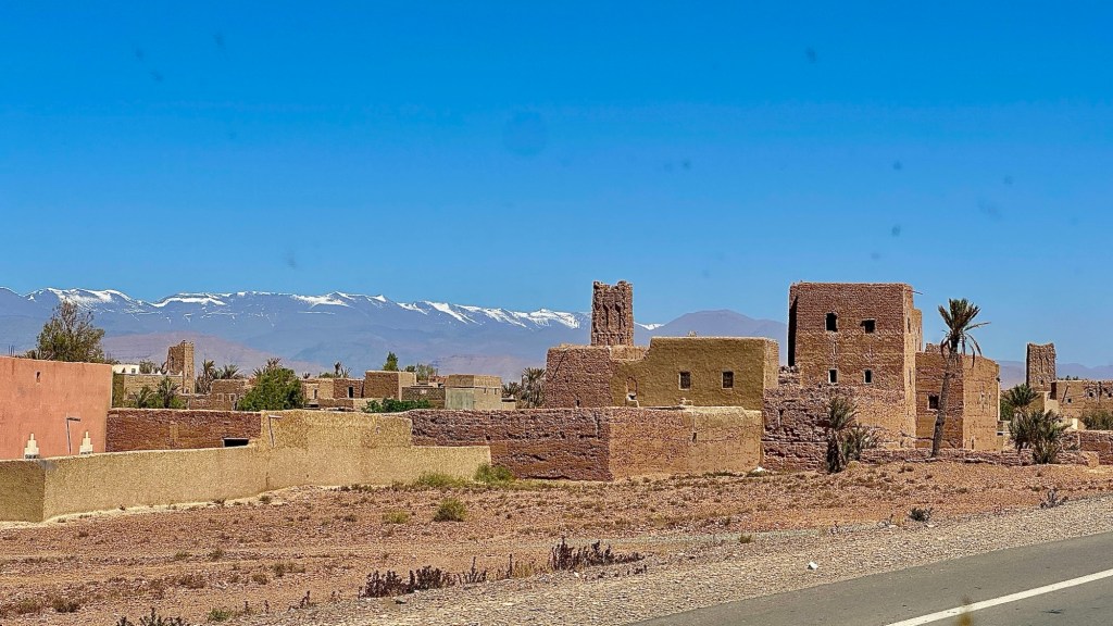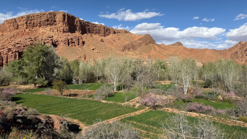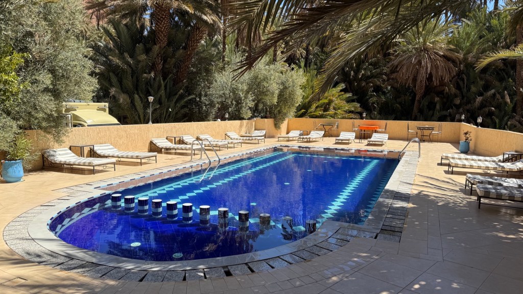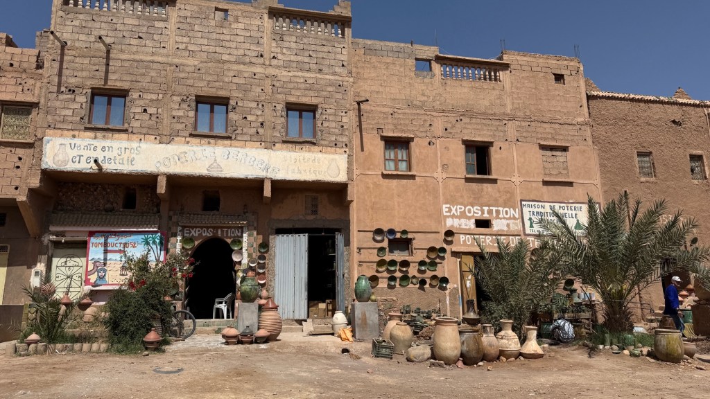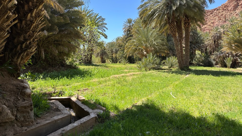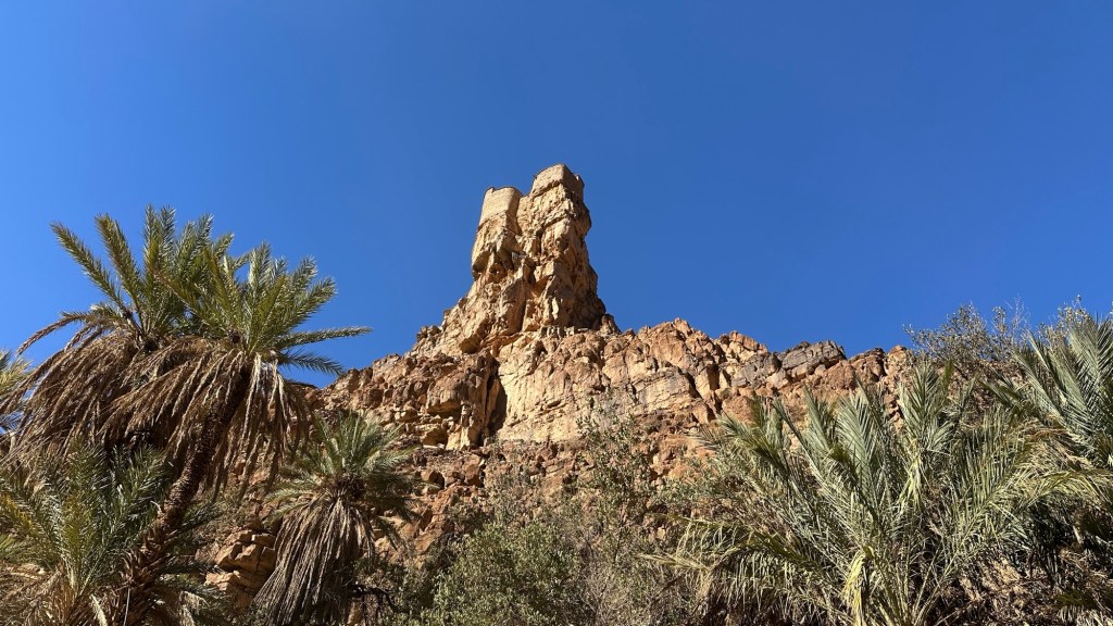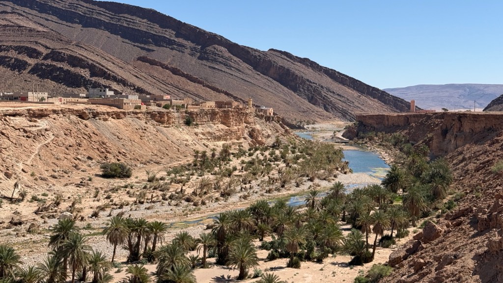 21.3.2025 Am Morgen ziehen wir von unserem Wüstenlager um auf den nahe gelegenen Campingplatz „Auberge El Khaima“ in Mhamid, wo wir sogar einen roten Teppich vors Wohnmobil gelegt bekommen. Um 10 h startet eine Jeep-Tour (genau genommen eine Toyota-Tour) in die Wüste bei Mhamid el Ghizlane. Wir werden in der endlosen Landschaft insgesamt mehr als 100 km durchgerüttelt und besuchen einige Nomaden. Diese sind auf unseren Besuch bestens vorbereitet. Sie verkaufen Souvenirs, bieten Tee an und zeigen uns ihre interessante Art, mit einfachsten Mitteln Brot zu backen. An den größeren Sanddünen, die wir mittags erreichen, ist alles für ein gutes Essen bereit, und auf dem Rückweg lassen sich dann auch noch die Dromedare bereitwillig fotografieren. Leicht erschöpft und verstaubt vom Tourismusprogramm sind wir gegen 17 h zurück auf dem Campingplatz.22.3.2025 Vormittags fahren wir auf guten Straßen und durch beeindruckende Landschaften knapp 200 km nach Agdz. Dabei führt uns die zweite Hälfte des Weges durch das schöne Draa-Tal mit seinen vielen Dattel-Palmen und kargen Bergen. Wir verbringen auf dem Campingplatz „Maison Tensift“ (mit Oasengarten) einen ruhigen Nachmittag. Nach der Reisebesprechung am frühen Abend gibt es im Restaurant des Platzes eine leckere Tajine, dieses Mal mit Hackfleischbällchen. Manfred überredet noch einen marokkanischen Bediensteten dazu, uns eine Flasche Weißwein zu besorgen … der Preis war allerdings mit „Ramadan-Zuschlag“ recht hoch. Den kostbaren Tropfen genießen wir zu sechst diskret in unserem Wohnmobil.„Buttered Camel with Biryani“„Nougat Frozen Candied Fruit Almond“23.3.2025 Insgesamt fahren wir heute 150 km durch die Berglandschaft. In Taznakht machen wir Halt, um etwas über die Teppichproduktion in Marokko zu erfahren … natürlich inklusive Kaufgelegenheit (die wir aber nicht nutzen). Mit schönen Blicken auf die schneebedeckten Berge des Hohen Atlas geht es anschließend weiter nach Ait Ben Haddou, wo wir bei starkem Wind Quartier auf einem einfachen Stellplatz beziehen. Am Nachmittag besichtigen wir das hiesige Lehmdorf, das als Unesco-Weltkulturerbe ein touristischer Hotspot in Marokko ist. Der Wind mausert sich zum Sturm, der Sandwolken durch die Landschaft treibt und unsere Besichtigung etwas ungemütlich macht. Den stürmischen Abend verbringen wir in der inzwischen etablierten Sechserrunde (mit Angelika, Andreas, Sigrid und Gerd) im Restaurant „Tanmirt“, wo wir das bisher mit Abstand beste Essen dieser Reise bekommen!24.3.2025 Parallel zur schneebedeckten Bergkette des Hohen Atlas fahren wir 160 km in die Dades-Schlucht, vorbei an kunstvoll beladenen Lkw und Minaretten mit Storchennestern. In der beeindruckenden Schlucht gibt es viele Hotels und Campingplätze, und unsere Gruppe bekommt ein Quartier am „Hotel Majorel“ mit bester Aussicht. Am Nachmittag wandern wir durch die wunderbar grüne Talsohle und erkunden den Canyon eines trockenen Nebenarms des Dades. Vom Wohnmobil aus haben wir einen wunderbaren Blick auf die sonnenbeschienenen Berge. Es wird ein schöner Abend bei unseren Nachbarn, deren Weinvorräte unerschöpflich sind. Das alles wird nur getrübt dadurch, dass Dagmar beim Zurückgehen einen der vorm Nachbar-WoMo abgestellten Schuhe vermisst …25.3.2025 In der Nacht ist es windig und kalt (wir sind auf 1670 m Höhe), es regnet und gewittert sogar. Am Morgen scheint dann aber wieder die Sonne, und Dagmar kann auch gleich den Schuhklau-Übeltäter samt seiner Beute stellen. Wir beschließen, für die weitere Erkundung der Dades-Schlucht unser Wohnmobil zu schonen und stattdessen mit den eBikes zu fahren. Bei mäßigem Autoverkehr radeln wir auch die wunderbaren Serpentinen hinauf und genießen die Aussicht. Noch etwas weiter im Tal (nach 16 km) erreichen wir die engste Stelle, an der sich größere Fahrzeuge aneinander vorbei mühen. Auf dem Rückweg genießen wir marokkanischen Pfefferminztee und bekommen auch eine Tajine mit Gemüse und Ei als spätes Frühstück. Zurück am Wohnmobil geht es dann nur gut 70 km weiter in die Todra-Schlucht, wo unsere Gruppe einmal mehr auf dem „Auberge Camping Atlas“ unter Palmen steht.26.3.2025 Heute ist „Ruhetag“, und wir fahren nicht weiter. Der Pool des Stellplatzes wirkt in der Sonne zwar verlockend, aber es sind trotzdem nur 15 Grad Lufttemperatur. Nach umfassender Abwägung verzichten wir auf das kühle Bad. Stattdessen queren wir zu Fuß das Flüsschen Todra, um dort den Oasengarten mit seinen Wasserrinnen, Dattelpalmen und etwas Landwirtschaft zu erkunden. Nachmittags machen wir noch eine kleine Radtour. Nur gut 5 km entfernt befindet sich die bekannte Engstelle der Todra-Schlucht mit bis zu 300 m hohen Steilwänden … ein Paradies für Kletterer.27.3.2025 Bereits um halb neun starten wir unsere Fahrt über gut 200 km in Richtung Erg Chebbi. Erster Halt ist das Berber-Museum in Tinejdad, wo wir viel über die Berber-Kultur erfahren. Dort gibt es auch Erklärungen zu den Khettaras, die wir uns beim zweiten Stopp ansehen. Es sind unterirdische Wasserkanäle, mit denen die Grundwasserschicht „angezapft“ wurde und dann das Wasser mit geringem Gefälle in Richtung einer Talsohle bis zur Oberfläche geleitet wurde. „Maulwurfshügel“ an der Oberfläche lassen den Verlauf gut erkennen. Nach einer Wüstenpizza und einem Dattel-Großeinkauf in Rissani fahren wir (ausnahmsweise im Konvoi) zum Hotel „Nomad Palace“ in Merzouga. Wir sind dort nah an den Sanddünen und lassen uns auf einen Dromedarritt ein. Mit sanftem Geschaukel geht es in die Dünen, um dort den Sonnenuntergang zu beobachten. Auch wenn das hier alles sehr „touristifiziert“ ist: Wir haben viel Spaß, und es ist ein schönes Erlebnis!28.3.2025 Auf dem Weg über gut 200 km in Ziz-Tal besuchen wir eine Fossilien-Schleiferei. Wir sind von der Auswahl und besonders von den großen Objekten sehr beeindruckt. Vom Stellplatz „Jurassic“ aus macht Dagmar am Nachmittag eine Wande