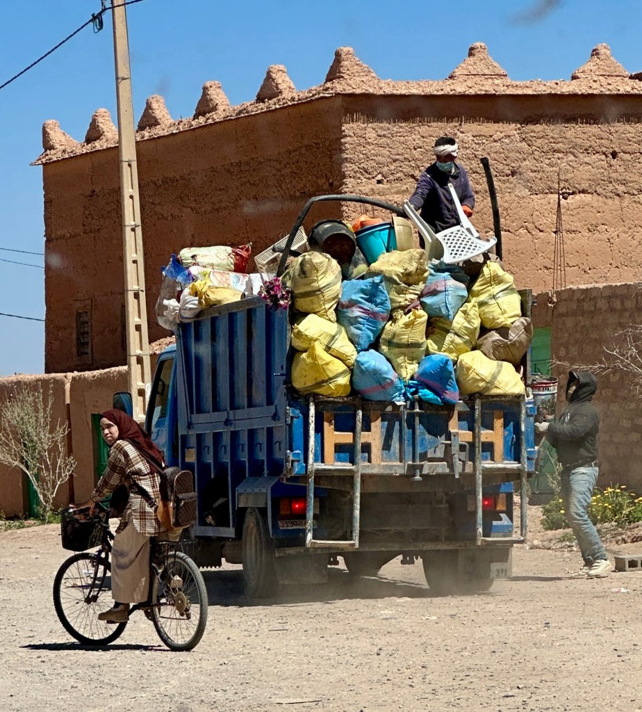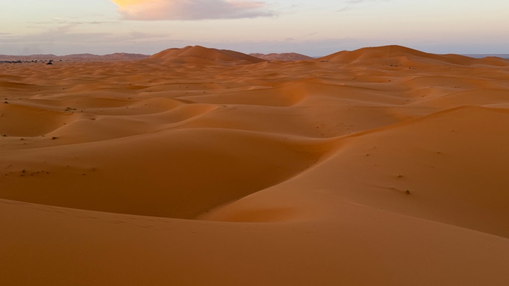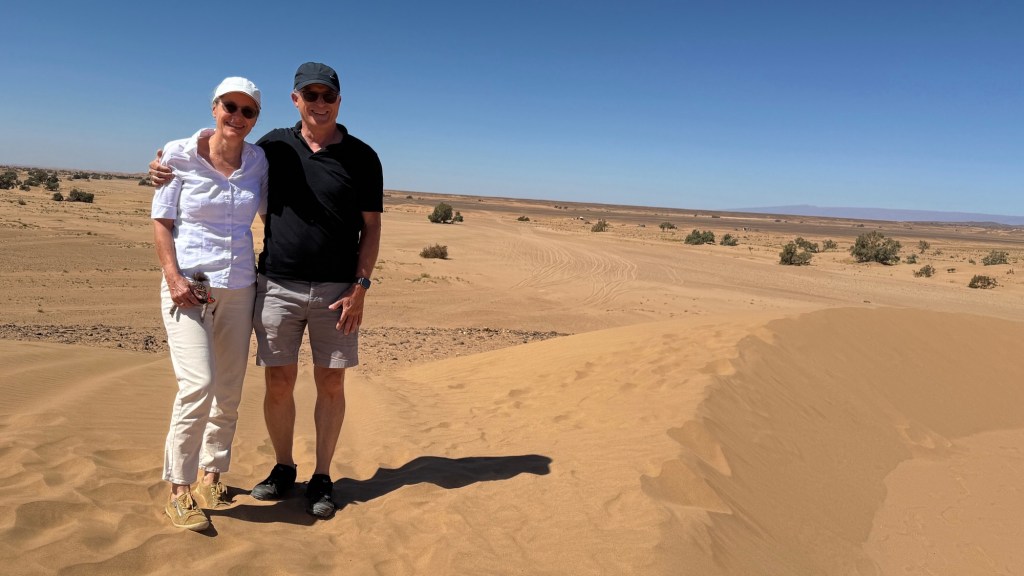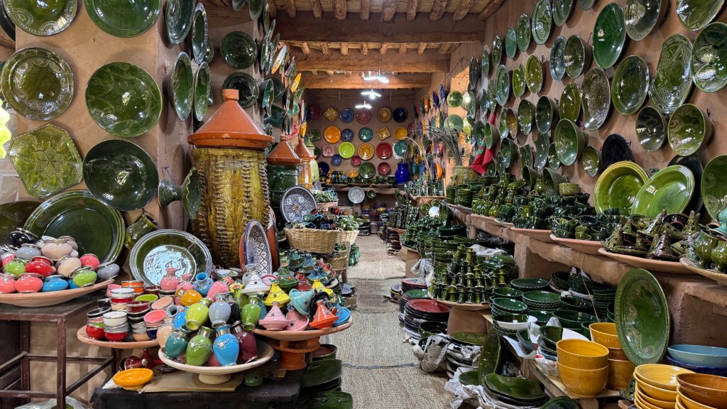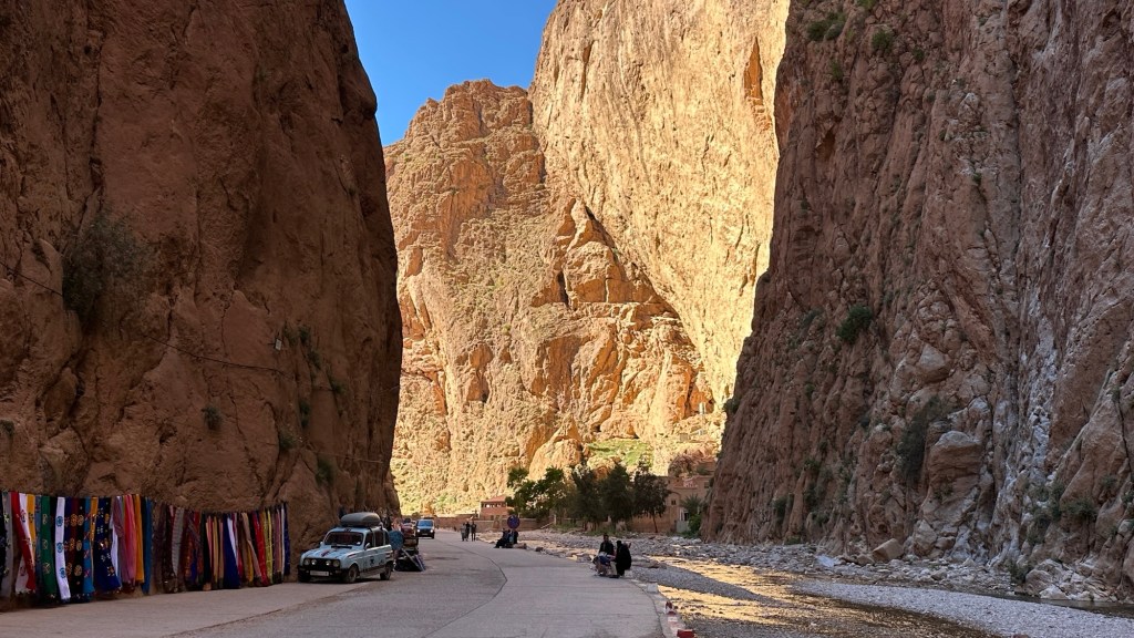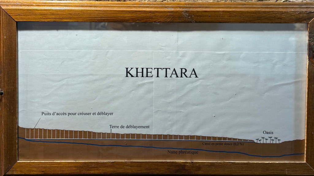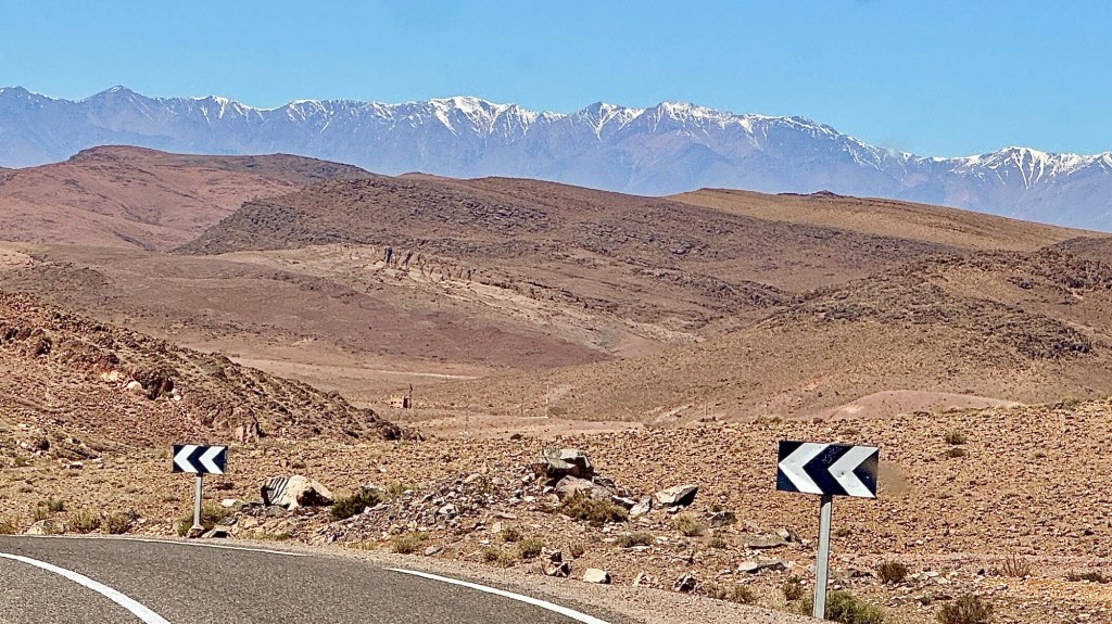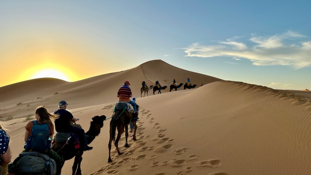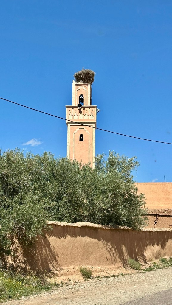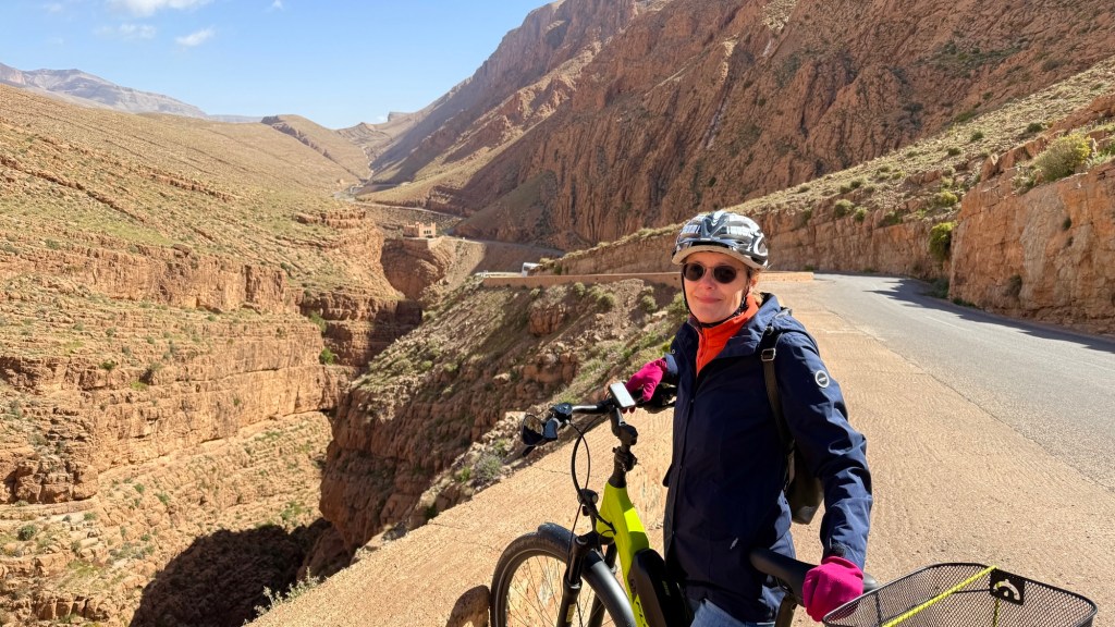 21.3.2025 Am Morgen ziehen wir von unserem Wüstenlager um auf den nahe gelegenen Campingplatz „Auberge El Khaima“ in Mhamid, wo wir sogar einen roten Teppich vors Wohnmobil gelegt bekommen. Um 10 h startet eine Jeep-Tour (genau genommen eine Toyota-Tour) in die Wüste bei Mhamid el Ghizlane. Wir werden in der endlosen Landschaft insgesamt mehr als 100 km durchgerüttelt und besuchen einige Nomaden. Diese sind auf unseren Besuch bestens vorbereitet. Sie verkaufen Souvenirs, bieten Tee an und zeigen uns ihre interessante Art, mit einfachsten Mitteln Brot zu backen. An den größeren Sanddünen, die wir mittags erreichen, ist alles für ein gutes Essen bereit, und auf dem Rückweg lassen sich dann auch noch die Dromedare bereitwillig fotografieren. Leicht erschöpft und verstaubt vom Tourismusprogramm sind wir gegen 17 h zurück auf dem Campingplatz.22.3.2025 Vormittags fahren wir auf guten Straßen und durch beeindruckende Landschaften knapp 200 km nach Agdz. Dabei führt uns die zweite Hälfte des Weges durch das schöne Draa-Tal mit seinen vielen Dattel-Palmen und kargen Bergen. Wir verbringen auf dem Campingplatz „Maison Tensift“ (mit Oasengarten) einen ruhigen Nachmittag. Nach der Reisebesprechung am frühen Abend gibt es im Restaurant des Platzes eine leckere Tajine, dieses Mal mit Hackfleischbällchen. Manfred überredet noch einen marokkanischen Bediensteten dazu, uns eine Flasche Weißwein zu besorgen … der Preis war allerdings mit „Ramadan-Zuschlag“ recht hoch. Den kostbaren Tropfen genießen wir zu sechst diskret in unserem Wohnmobil.„Buttered Camel with Biryani“„Nougat Frozen Candied Fruit Almond“23.3.2025 Insgesamt fahren wir heute 150 km durch die Berglandschaft. In Taznakht machen wir Halt, um etwas über die Teppichproduktion in Marokko zu erfahren … natürlich inklusive Kaufgelegenheit (die wir aber nicht nutzen). Mit schönen Blicken auf die schneebedeckten Berge des Hohen Atlas geht es anschließend weiter nach Ait Ben Haddou, wo wir bei starkem Wind Quartier auf einem einfachen Stellplatz beziehen. Am Nachmittag besichtigen wir das hiesige Lehmdorf, das als Unesco-Weltkulturerbe ein touristischer Hotspot in Marokko ist. Der Wind mausert sich zum Sturm, der Sandwolken durch die Landschaft treibt und unsere Besichtigung etwas ungemütlich macht. Den stürmischen Abend verbringen wir in der inzwischen etablierten Sechserrunde (mit Angelika, Andreas, Sigrid und Gerd) im Restaurant „Tanmirt“, wo wir das bisher mit Abstand beste Essen dieser Reise bekommen!24.3.2025 Parallel zur schneebedeckten Bergkette des Hohen Atlas fahren wir 160 km in die Dades-Schlucht, vorbei an kunstvoll beladenen Lkw und Minaretten mit Storchennestern. In der beeindruckenden Schlucht gibt es viele Hotels und Campingplätze, und unsere Gruppe bekommt ein Quartier am „Hotel Majorel“ mit bester Aussicht. Am Nachmittag wandern wir durch die wunderbar grüne Talsohle und erkunden den Canyon eines trockenen Nebenarms des Dades. Vom Wohnmobil aus haben wir einen wunderbaren Blick auf die sonnenbeschienenen Berge. Es wird ein schöner Abend bei unseren Nachbarn, deren Weinvorräte unerschöpflich sind. Das alles wird nur getrübt dadurch, dass Dagmar beim Zurückgehen einen der vorm Nachbar-WoMo abgestellten Schuhe vermisst …25.3.2025 In der Nacht ist es windig und kalt (wir sind auf 1670 m Höhe), es regnet und gewittert sogar. Am Morgen scheint dann aber wieder die Sonne, und Dagmar kann auch gleich den Schuhklau-Übeltäter samt seiner Beute stellen. Wir beschließen, für die weitere Erkundung der Dades-Schlucht unser Wohnmobil zu schonen und stattdessen mit den eBikes zu fahren. Bei mäßigem Autoverkehr radeln wir auch die wunderbaren Serpentinen hinauf und genießen die Aussicht. Noch etwas weiter im Tal (nach 16 km) erreichen wir die engste Stelle, an der sich größere Fahrzeuge aneinander vorbei mühen. Auf dem Rückweg genießen wir marokkanischen Pfefferminztee und bekommen auch eine Tajine mit Gemüse und Ei als spätes Frühstück. Zurück am Wohnmobil geht es dann nur gut 70 km weiter in die Todra-Schlucht, wo unsere Gruppe einmal mehr auf dem „Auberge Camping Atlas“ unter Palmen steht.26.3.2025 Heute ist „Ruhetag“, und wir fahren nicht weiter. Der Pool des Stellplatzes wirkt in der Sonne zwar verlockend, aber es sind trotzdem nur 15 Grad Lufttemperatur. Nach umfassender Abwägung verzichten wir auf das kühle Bad. Stattdessen queren wir zu Fuß das Flüsschen Todra, um dort den Oasengarten mit seinen Wasserrinnen, Dattelpalmen und etwas Landwirtschaft zu erkunden. Nachmittags machen wir noch eine kleine Radtour. Nur gut 5 km entfernt befindet sich die bekannte Engstelle der Todra-Schlucht mit bis zu 300 m hohen Steilwänden … ein Paradies für Kletterer.27.3.2025 Bereits um halb neun starten wir unsere Fahrt über gut 200 km in Richtung Erg Chebbi. Erster Halt ist das Berber-Museum in Tinejdad, wo wir viel über die Berber-Kultur erfahren. Dort gibt es auch Erklärungen zu den Khettaras, die wir uns beim zweiten Stopp ansehen. Es sind unterirdische Wasserkanäle, mit denen die Grundwasserschicht „angezapft“ wurde und dann das Wasser mit geringem Gefälle in Richtung einer Talsohle bis zur Oberfläche geleitet wurde. „Maulwurfshügel“ an der Oberfläche lassen den Verlauf gut erkennen. Nach einer Wüstenpizza und einem Dattel-Großeinkauf in Rissani fahren wir (ausnahmsweise im Konvoi) zum Hotel „Nomad Palace“ in Merzouga. Wir sind dort nah an den Sanddünen und lassen uns auf einen Dromedarritt ein. Mit sanftem Geschaukel geht es in die Dünen, um dort den Sonnenuntergang zu beobachten. Auch wenn das hier alles sehr „touristifiziert“ ist: Wir haben viel Spaß, und es ist ein schönes Erlebnis!28.3.2025 Auf dem Weg über gut 200 km in Ziz-Tal besuchen wir eine Fossilien-Schleiferei. Wir sind von der Auswahl und besonders von den großen Objekten sehr beeindruckt. Vom Stellplatz „Jurassic“ aus macht Dagmar am Nachmittag eine Wande