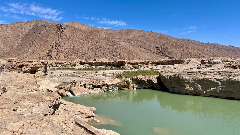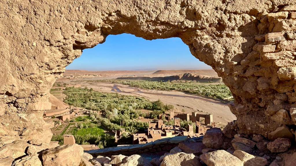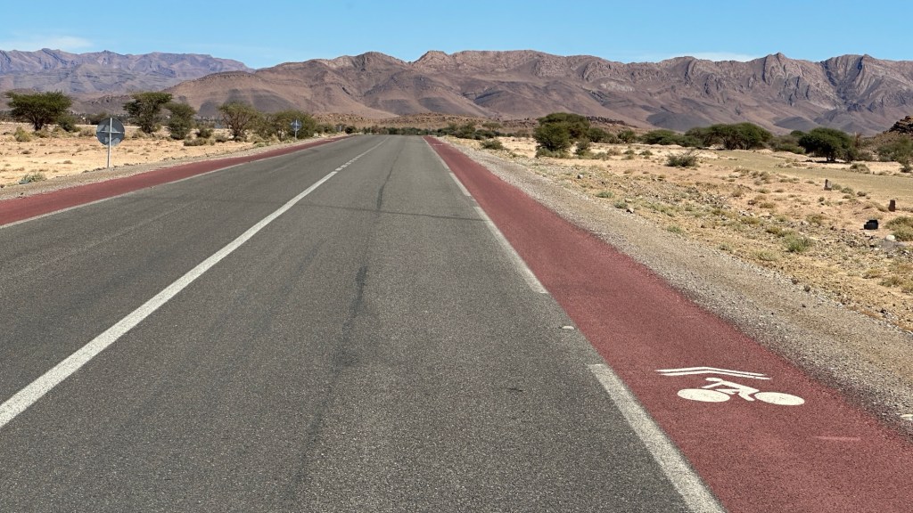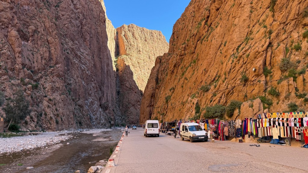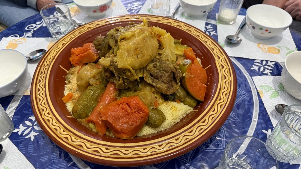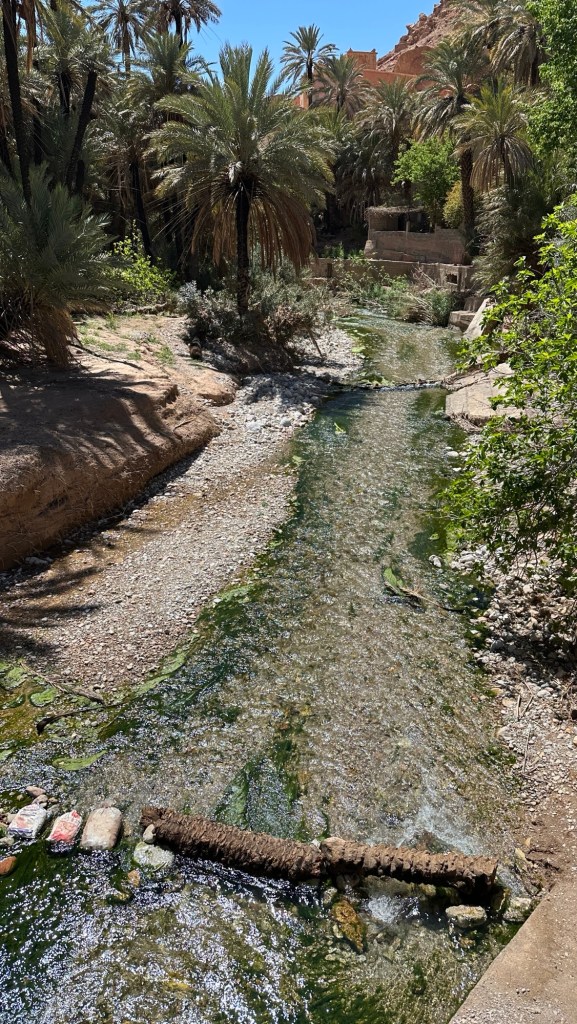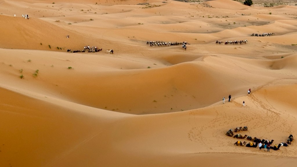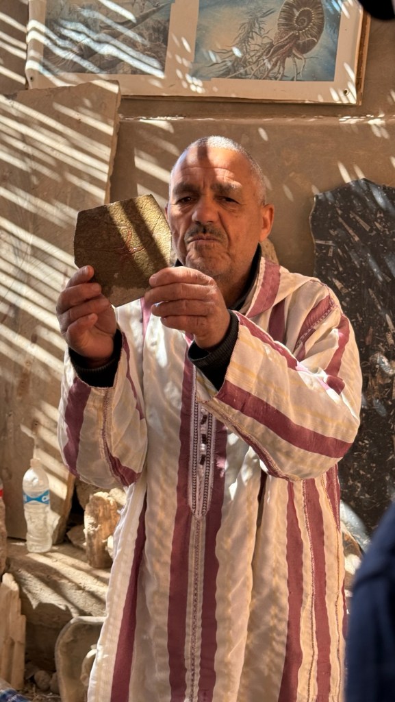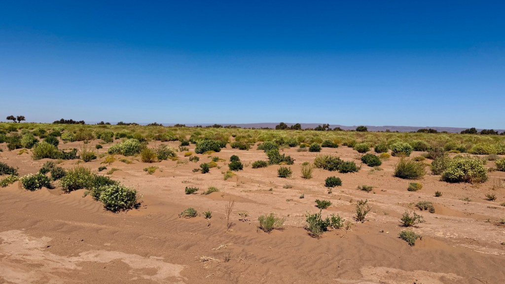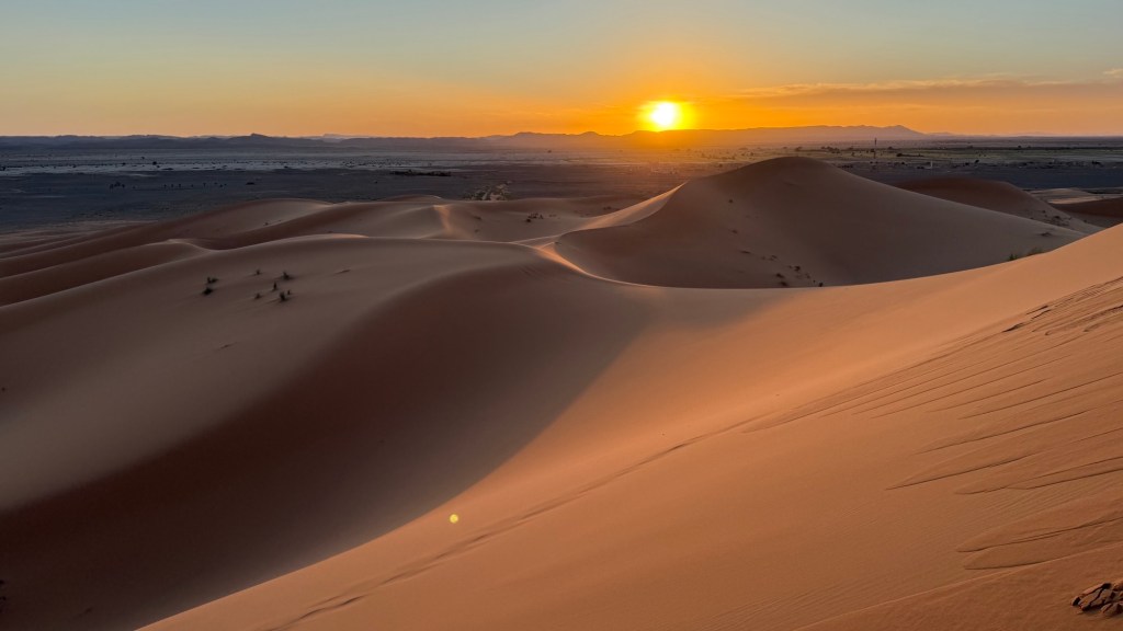 21.3.2025 Am Morgen ziehen wir von unserem Wüstenlager um auf den nahe gelegenen Campingplatz „Auberge El Khaima“ in Mhamid, wo wir sogar einen roten Teppich vors Wohnmobil gelegt bekommen. Um 10 h startet eine Jeep-Tour (genau genommen eine Toyota-Tour) in die Wüste bei Mhamid el Ghizlane. Wir werden in der endlosen Landschaft insgesamt mehr als 100 km durchgerüttelt und besuchen einige Nomaden. Diese sind auf unseren Besuch bestens vorbereitet. Sie verkaufen Souvenirs, bieten Tee an und zeigen uns ihre interessante Art, mit einfachsten Mitteln Brot zu backen. An den größeren Sanddünen, die wir mittags erreichen, ist alles für ein gutes Essen bereit, und auf dem Rückweg lassen sich dann auch noch die Dromedare bereitwillig fotografieren. Leicht erschöpft und verstaubt vom Tourismusprogramm sind wir gegen 17 h zurück auf dem Campingplatz.22.3.2025 Vormittags fahren wir auf guten Straßen und durch beeindruckende Landschaften knapp 200 km nach Agdz. Dabei führt uns die zweite Hälfte des Weges durch das schöne Draa-Tal mit seinen vielen Dattel-Palmen und kargen Bergen. Wir verbringen auf dem Campingplatz „Maison Tensift“ (mit Oasengarten) einen ruhigen Nachmittag. Nach der Reisebesprechung am frühen Abend gibt es im Restaurant des Platzes eine leckere Tajine, dieses Mal mit Hackfleischbällchen. Manfred überredet noch einen marokkanischen Bediensteten dazu, uns eine Flasche Weißwein zu besorgen … der Preis war allerdings mit „Ramadan-Zuschlag“ recht hoch. Den kostbaren Tropfen genießen wir zu sechst diskret in unserem Wohnmobil.„Buttered Camel with Biryani“„Nougat Frozen Candied Fruit Almond“23.3.2025 Insgesamt fahren wir heute 150 km durch die Berglandschaft. In Taznakht machen wir Halt, um etwas über die Teppichproduktion in Marokko zu erfahren … natürlich inklusive Kaufgelegenheit (die wir aber nicht nutzen). Mit schönen Blicken auf die schneebedeckten Berge des Hohen Atlas geht es anschließend weiter nach Ait Ben Haddou, wo wir bei starkem Wind Quartier auf einem einfachen Stellplatz beziehen. Am Nachmittag besichtigen wir das hiesige Lehmdorf, das als Unesco-Weltkulturerbe ein touristischer Hotspot in Marokko ist. Der Wind mausert sich zum Sturm, der Sandwolken durch die Landschaft treibt und unsere Besichtigung etwas ungemütlich macht. Den stürmischen Abend verbringen wir in der inzwischen etablierten Sechserrunde (mit Angelika, Andreas, Sigrid und Gerd) im Restaurant „Tanmirt“, wo wir das bisher mit Abstand beste Essen dieser Reise bekommen!24.3.2025 Parallel zur schneebedeckten Bergkette des Hohen Atlas fahren wir 160 km in die Dades-Schlucht, vorbei an kunstvoll beladenen Lkw und Minaretten mit Storchennestern. In der beeindruckenden Schlucht gibt es viele Hotels und Campingplätze, und unsere Gruppe bekommt ein Quartier am „Hotel Majorel“ mit bester Aussicht. Am Nachmittag wandern wir durch die wunderbar grüne Talsohle und erkunden den Canyon eines trockenen Nebenarms des Dades. Vom Wohnmobil aus haben wir einen wunderbaren Blick auf die sonnenbeschienenen Berge. Es wird ein schöner Abend bei unseren Nachbarn, deren Weinvorräte unerschöpflich sind. Das alles wird nur getrübt dadurch, dass Dagmar beim Zurückgehen einen der vorm Nachbar-WoMo abgestellten Schuhe vermisst …25.3.2025 In der Nacht ist es windig und kalt (wir sind auf 1670 m Höhe), es regnet und gewittert sogar. Am Morgen scheint dann aber wieder die Sonne, und Dagmar kann auch gleich den Schuhklau-Übeltäter samt seiner Beute stellen. Wir beschließen, für die weitere Erkundung der Dades-Schlucht unser Wohnmobil zu schonen und stattdessen mit den eBikes zu fahren. Bei mäßigem Autoverkehr radeln wir auch die wunderbaren Serpentinen hinauf und genießen die Aussicht. Noch etwas weiter im Tal (nach 16 km) erreichen wir die engste Stelle, an der sich größere Fahrzeuge aneinander vorbei mühen. Auf dem Rückweg genießen wir marokkanischen Pfefferminztee und bekommen auch eine Tajine mit Gemüse und Ei als spätes Frühstück. Zurück am Wohnmobil geht es dann nur gut 70 km weiter in die Todra-Schlucht, wo unsere Gruppe einmal mehr auf dem „Auberge Camping Atlas“ unter Palmen steht.26.3.2025 Heute ist „Ruhetag“, und wir fahren nicht weiter. Der Pool des Stellplatzes wirkt in der Sonne zwar verlockend, aber es sind trotzdem nur 15 Grad Lufttemperatur. Nach umfassender Abwägung verzichten wir auf das kühle Bad. Stattdessen queren wir zu Fuß das Flüsschen Todra, um dort den Oasengarten mit seinen Wasserrinnen, Dattelpalmen und etwas Landwirtschaft zu erkunden. Nachmittags machen wir noch eine kleine Radtour. Nur gut 5 km entfernt befindet sich die bekannte Engstelle der Todra-Schlucht mit bis zu 300 m hohen Steilwänden … ein Paradies für Kletterer.27.3.2025 Bereits um halb neun starten wir unsere Fahrt über gut 200 km in Richtung Erg Chebbi. Erster Halt ist das Berber-Museum in Tinejdad, wo wir viel über die Berber-Kultur erfahren. Dort gibt es auch Erklärungen zu den Khettaras, die wir uns beim zweiten Stopp ansehen. Es sind unterirdische Wasserkanäle, mit denen die Grundwasserschicht „angezapft“ wurde und dann das Wasser mit geringem Gefälle in Richtung einer Talsohle bis zur Oberfläche geleitet wurde. „Maulwurfshügel“ an der Oberfläche lassen den Verlauf gut erkennen. Nach einer Wüstenpizza und einem Dattel-Großeinkauf in Rissani fahren wir (ausnahmsweise im Konvoi) zum Hotel „Nomad Palace“ in Merzouga. Wir sind dort nah an den Sanddünen und lassen uns auf einen Dromedarritt ein. Mit sanftem Geschaukel geht es in die Dünen, um dort den Sonnenuntergang zu beobachten. Auch wenn das hier alles sehr „touristifiziert“ ist: Wir haben viel Spaß, und es ist ein schönes Erlebnis!28.3.2025 Auf dem Weg über gut 200 km in Ziz-Tal besuchen wir eine Fossilien-Schleiferei. Wir sind von der Auswahl und besonders von den großen Objekten sehr beeindruckt. Vom Stellplatz „Jurassic“ aus macht Dagmar am Nachmittag eine Wande