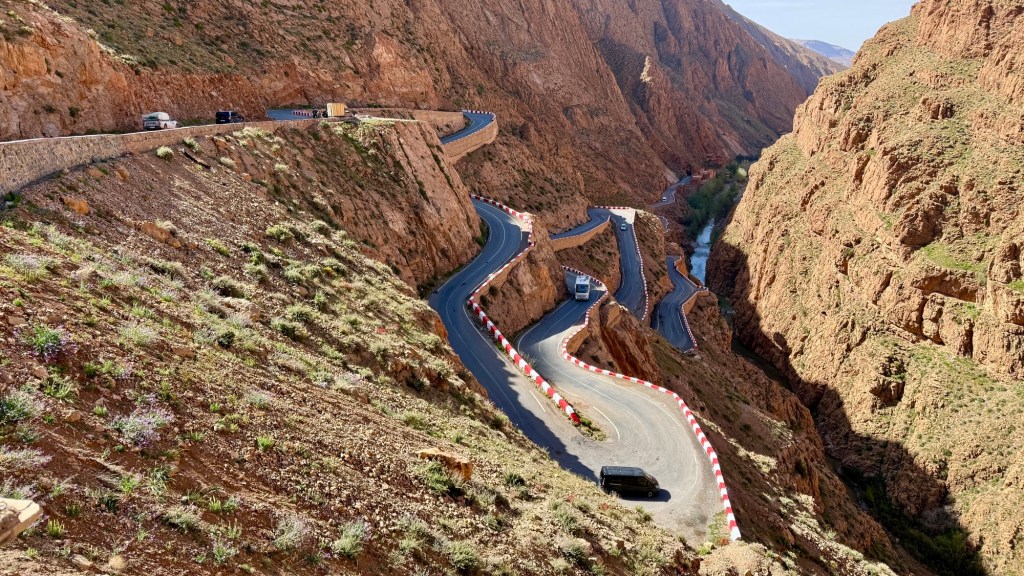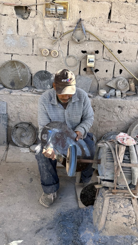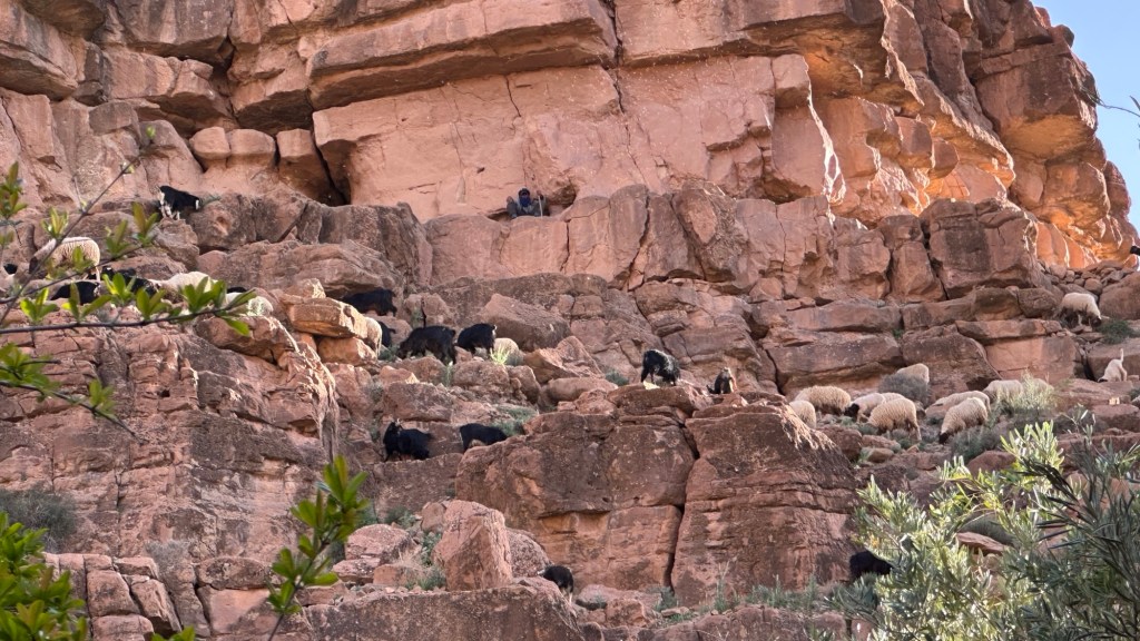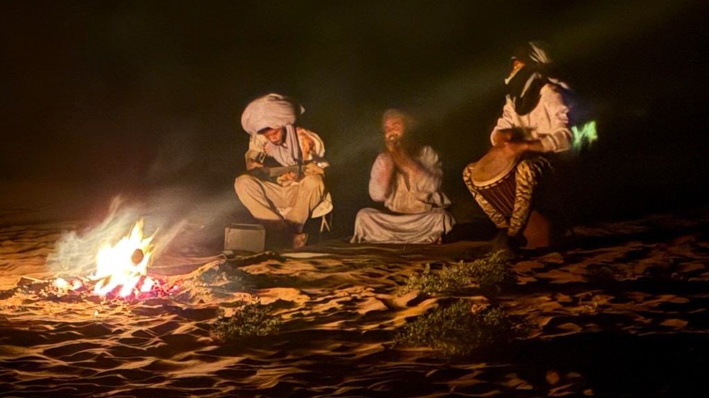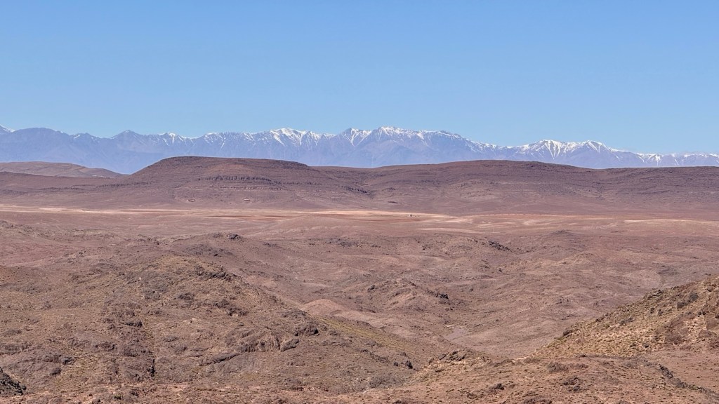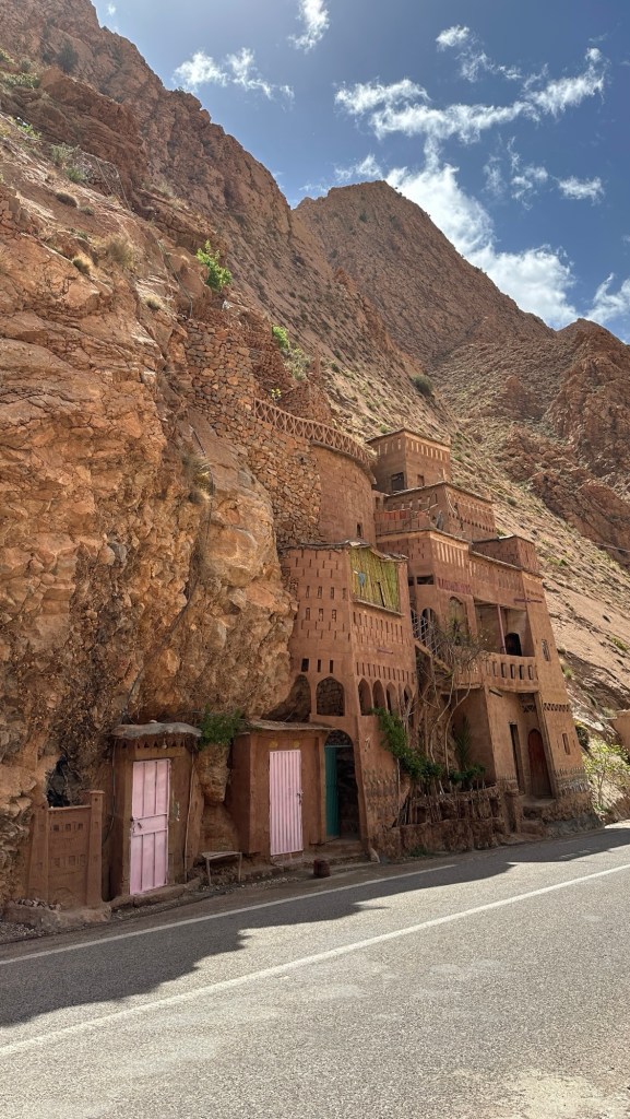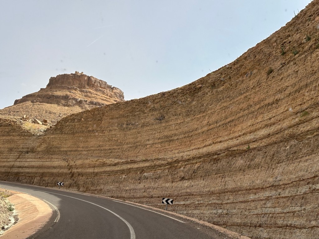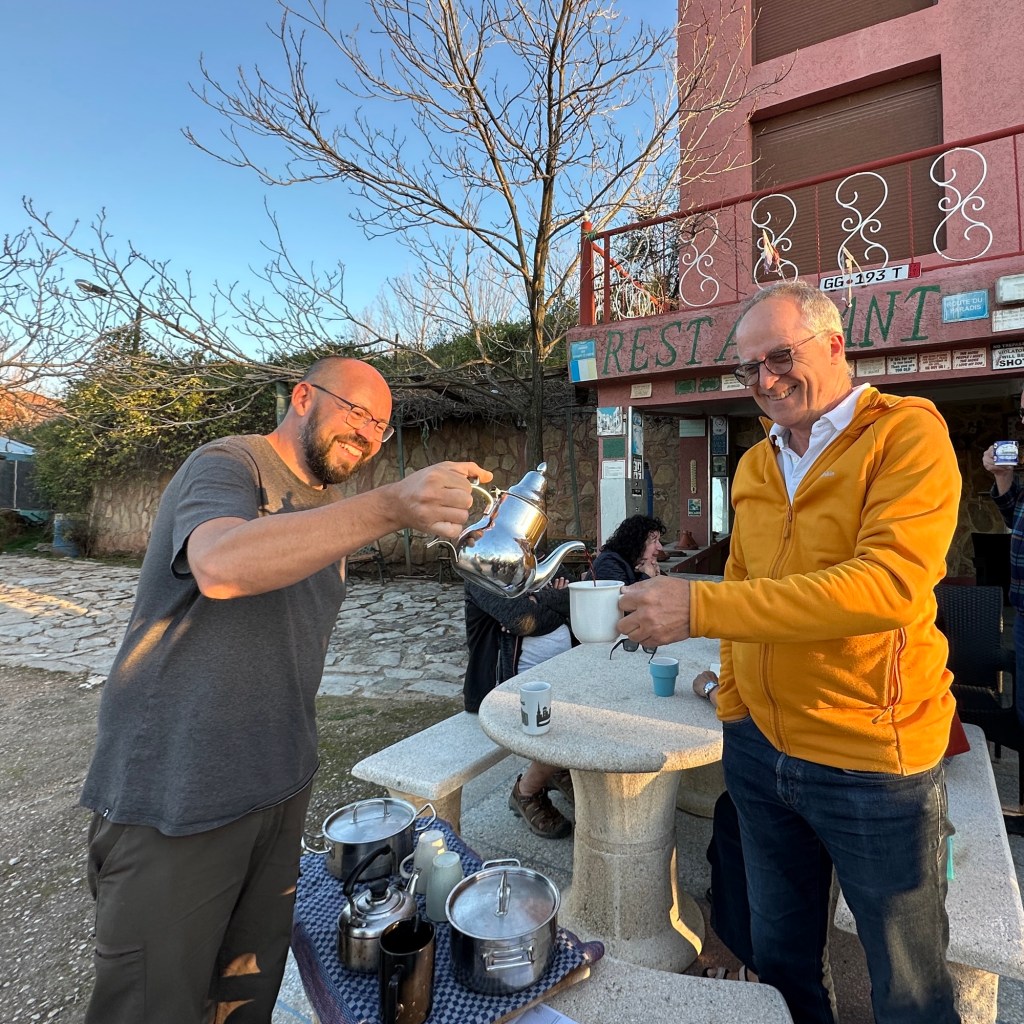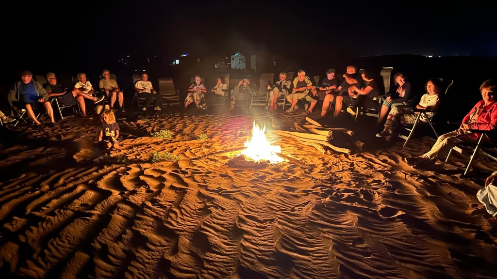 21.3.2025 Am Morgen ziehen wir von unserem Wüstenlager um auf den nahe gelegenen Campingplatz „Auberge El Khaima“ in Mhamid, wo wir sogar einen roten Teppich vors Wohnmobil gelegt bekommen. Um 10 h startet eine Jeep-Tour (genau genommen eine Toyota-Tour) in die Wüste bei Mhamid el Ghizlane. Wir werden in der endlosen Landschaft insgesamt mehr als 100 km durchgerüttelt und besuchen einige Nomaden. Diese sind auf unseren Besuch bestens vorbereitet. Sie verkaufen Souvenirs, bieten Tee an und zeigen uns ihre interessante Art, mit einfachsten Mitteln Brot zu backen. An den größeren Sanddünen, die wir mittags erreichen, ist alles für ein gutes Essen bereit, und auf dem Rückweg lassen sich dann auch noch die Dromedare bereitwillig fotografieren. Leicht erschöpft und verstaubt vom Tourismusprogramm sind wir gegen 17 h zurück auf dem Campingplatz.22.3.2025 Vormittags fahren wir auf guten Straßen und durch beeindruckende Landschaften knapp 200 km nach Agdz. Dabei führt uns die zweite Hälfte des Weges durch das schöne Draa-Tal mit seinen vielen Dattel-Palmen und kargen Bergen. Wir verbringen auf dem Campingplatz „Maison Tensift“ (mit Oasengarten) einen ruhigen Nachmittag. Nach der Reisebesprechung am frühen Abend gibt es im Restaurant des Platzes eine leckere Tajine, dieses Mal mit Hackfleischbällchen. Manfred überredet noch einen marokkanischen Bediensteten dazu, uns eine Flasche Weißwein zu besorgen … der Preis war allerdings mit „Ramadan-Zuschlag“ recht hoch. Den kostbaren Tropfen genießen wir zu sechst diskret in unserem Wohnmobil.„Buttered Camel with Biryani“„Nougat Frozen Candied Fruit Almond“23.3.2025 Insgesamt fahren wir heute 150 km durch die Berglandschaft. In Taznakht machen wir Halt, um etwas über die Teppichproduktion in Marokko zu erfahren … natürlich inklusive Kaufgelegenheit (die wir aber nicht nutzen). Mit schönen Blicken auf die schneebedeckten Berge des Hohen Atlas geht es anschließend weiter nach Ait Ben Haddou, wo wir bei starkem Wind Quartier auf einem einfachen Stellplatz beziehen. Am Nachmittag besichtigen wir das hiesige Lehmdorf, das als Unesco-Weltkulturerbe ein touristischer Hotspot in Marokko ist. Der Wind mausert sich zum Sturm, der Sandwolken durch die Landschaft treibt und unsere Besichtigung etwas ungemütlich macht. Den stürmischen Abend verbringen wir in der inzwischen etablierten Sechserrunde (mit Angelika, Andreas, Sigrid und Gerd) im Restaurant „Tanmirt“, wo wir das bisher mit Abstand beste Essen dieser Reise bekommen!24.3.2025 Parallel zur schneebedeckten Bergkette des Hohen Atlas fahren wir 160 km in die Dades-Schlucht, vorbei an kunstvoll beladenen Lkw und Minaretten mit Storchennestern. In der beeindruckenden Schlucht gibt es viele Hotels und Campingplätze, und unsere Gruppe bekommt ein Quartier am „Hotel Majorel“ mit bester Aussicht. Am Nachmittag wandern wir durch die wunderbar grüne Talsohle und erkunden den Canyon eines trockenen Nebenarms des Dades. Vom Wohnmobil aus haben wir einen wunderbaren Blick auf die sonnenbeschienenen Berge. Es wird ein schöner Abend bei unseren Nachbarn, deren Weinvorräte unerschöpflich sind. Das alles wird nur getrübt dadurch, dass Dagmar beim Zurückgehen einen der vorm Nachbar-WoMo abgestellten Schuhe vermisst …25.3.2025 In der Nacht ist es windig und kalt (wir sind auf 1670 m Höhe), es regnet und gewittert sogar. Am Morgen scheint dann aber wieder die Sonne, und Dagmar kann auch gleich den Schuhklau-Übeltäter samt seiner Beute stellen. Wir beschließen, für die weitere Erkundung der Dades-Schlucht unser Wohnmobil zu schonen und stattdessen mit den eBikes zu fahren. Bei mäßigem Autoverkehr radeln wir auch die wunderbaren Serpentinen hinauf und genießen die Aussicht. Noch etwas weiter im Tal (nach 16 km) erreichen wir die engste Stelle, an der sich größere Fahrzeuge aneinander vorbei mühen. Auf dem Rückweg genießen wir marokkanischen Pfefferminztee und bekommen auch eine Tajine mit Gemüse und Ei als spätes Frühstück. Zurück am Wohnmobil geht es dann nur gut 70 km weiter in die Todra-Schlucht, wo unsere Gruppe einmal mehr auf dem „Auberge Camping Atlas“ unter Palmen steht.26.3.2025 Heute ist „Ruhetag“, und wir fahren nicht weiter. Der Pool des Stellplatzes wirkt in der Sonne zwar verlockend, aber es sind trotzdem nur 15 Grad Lufttemperatur. Nach umfassender Abwägung verzichten wir auf das kühle Bad. Stattdessen queren wir zu Fuß das Flüsschen Todra, um dort den Oasengarten mit seinen Wasserrinnen, Dattelpalmen und etwas Landwirtschaft zu erkunden. Nachmittags machen wir noch eine kleine Radtour. Nur gut 5 km entfernt befindet sich die bekannte Engstelle der Todra-Schlucht mit bis zu 300 m hohen Steilwänden … ein Paradies für Kletterer.27.3.2025 Bereits um halb neun starten wir unsere Fahrt über gut 200 km in Richtung Erg Chebbi. Erster Halt ist das Berber-Museum in Tinejdad, wo wir viel über die Berber-Kultur erfahren. Dort gibt es auch Erklärungen zu den Khettaras, die wir uns beim zweiten Stopp ansehen. Es sind unterirdische Wasserkanäle, mit denen die Grundwasserschicht „angezapft“ wurde und dann das Wasser mit geringem Gefälle in Richtung einer Talsohle bis zur Oberfläche geleitet wurde. „Maulwurfshügel“ an der Oberfläche lassen den Verlauf gut erkennen. Nach einer Wüstenpizza und einem Dattel-Großeinkauf in Rissani fahren wir (ausnahmsweise im Konvoi) zum Hotel „Nomad Palace“ in Merzouga. Wir sind dort nah an den Sanddünen und lassen uns auf einen Dromedarritt ein. Mit sanftem Geschaukel geht es in die Dünen, um dort den Sonnenuntergang zu beobachten. Auch wenn das hier alles sehr „touristifiziert“ ist: Wir haben viel Spaß, und es ist ein schönes Erlebnis!28.3.2025 Auf dem Weg über gut 200 km in Ziz-Tal besuchen wir eine Fossilien-Schleiferei. Wir sind von der Auswahl und besonders von den großen Objekten sehr beeindruckt. Vom Stellplatz „Jurassic“ aus macht Dagmar am Nachmittag eine Wande