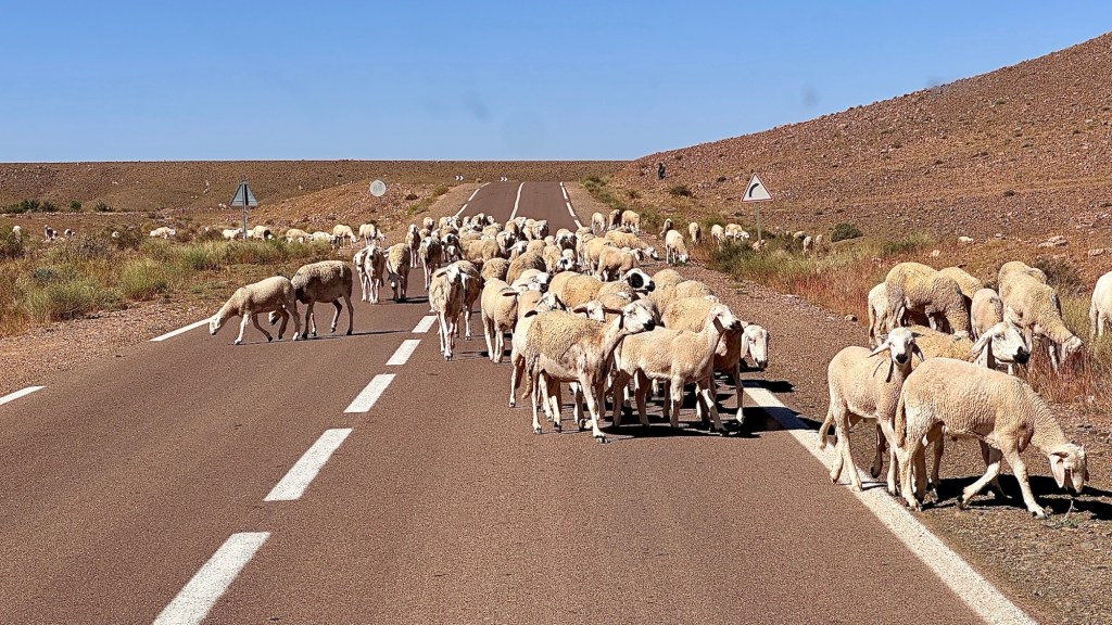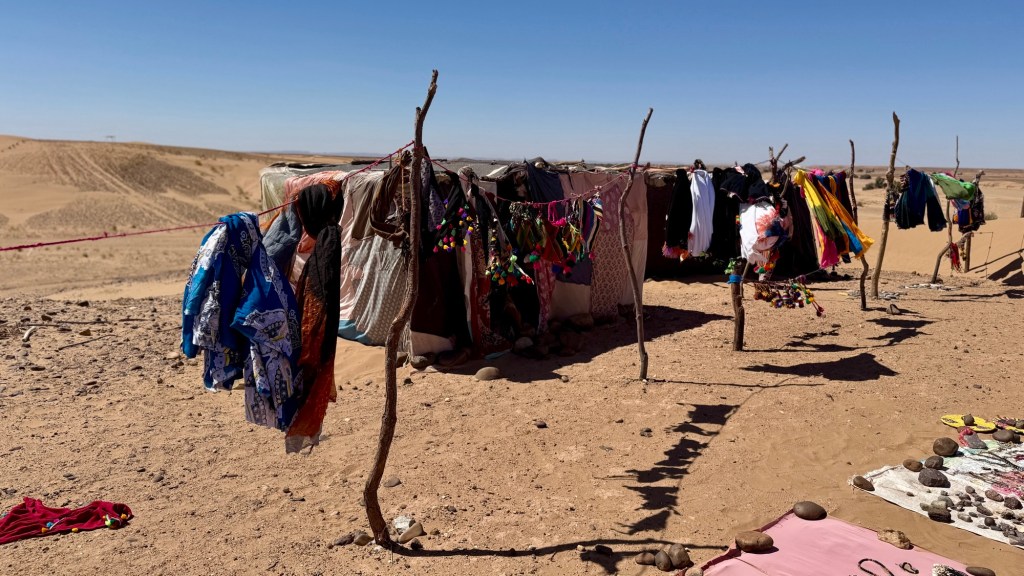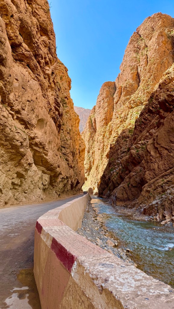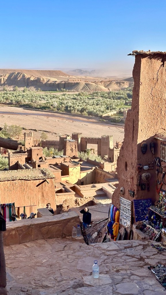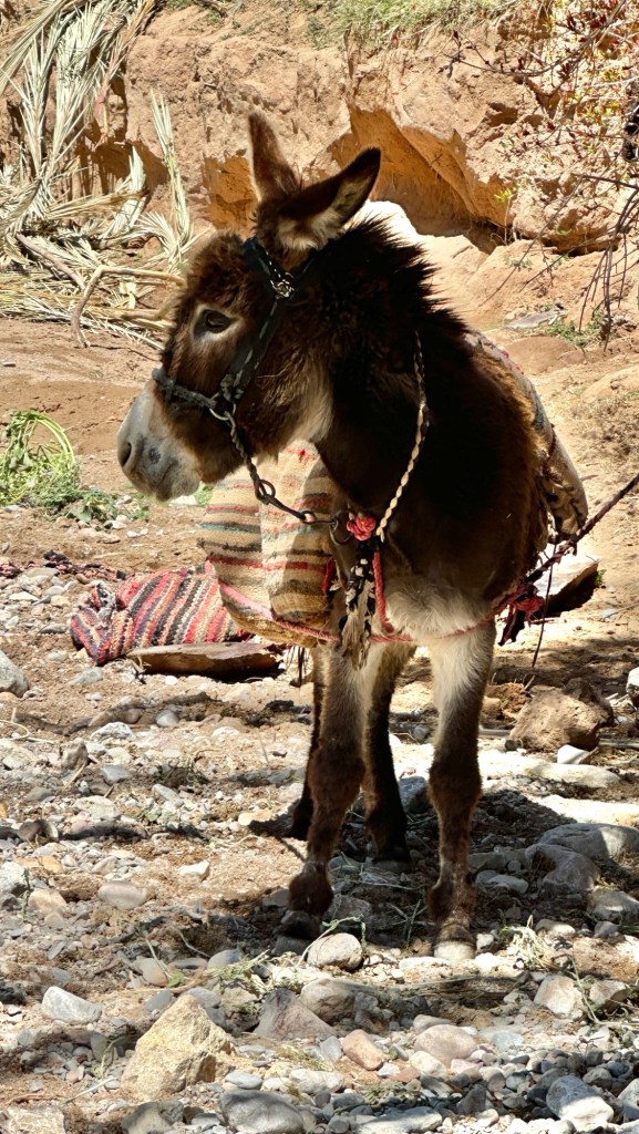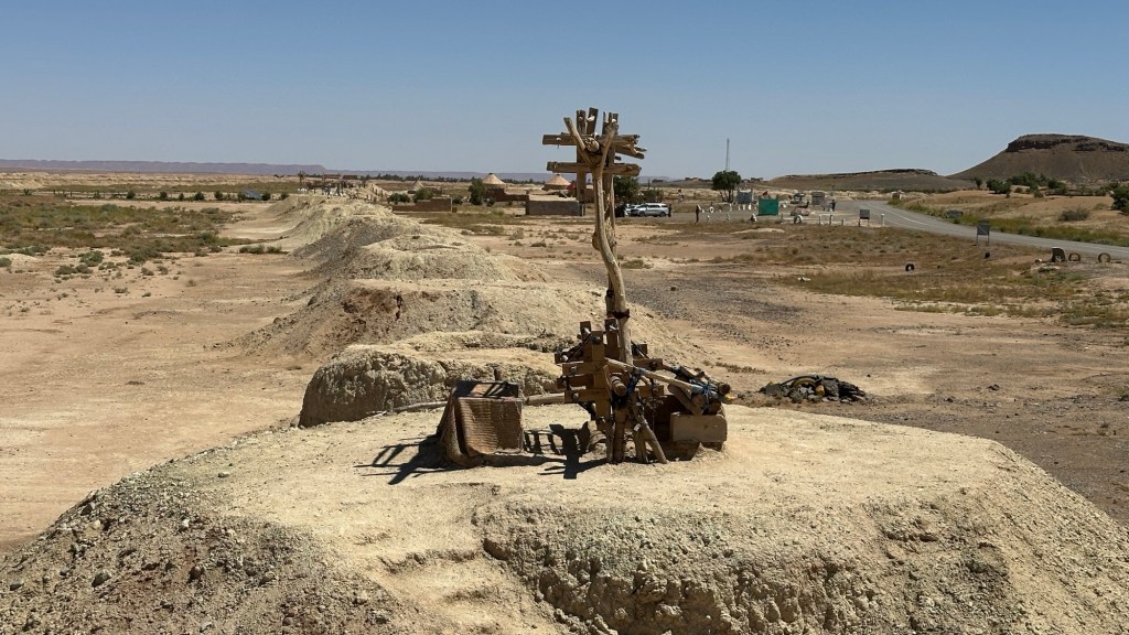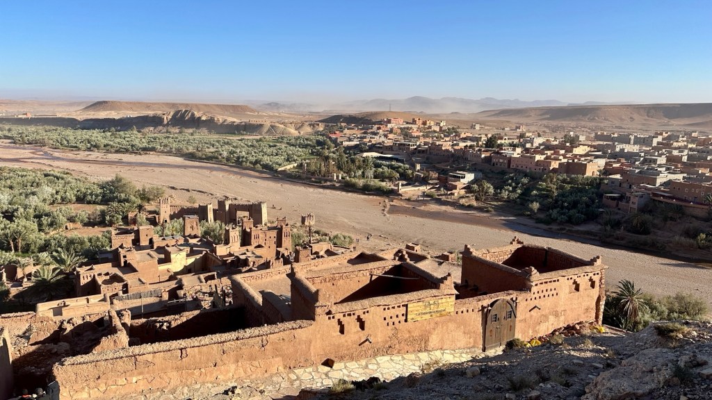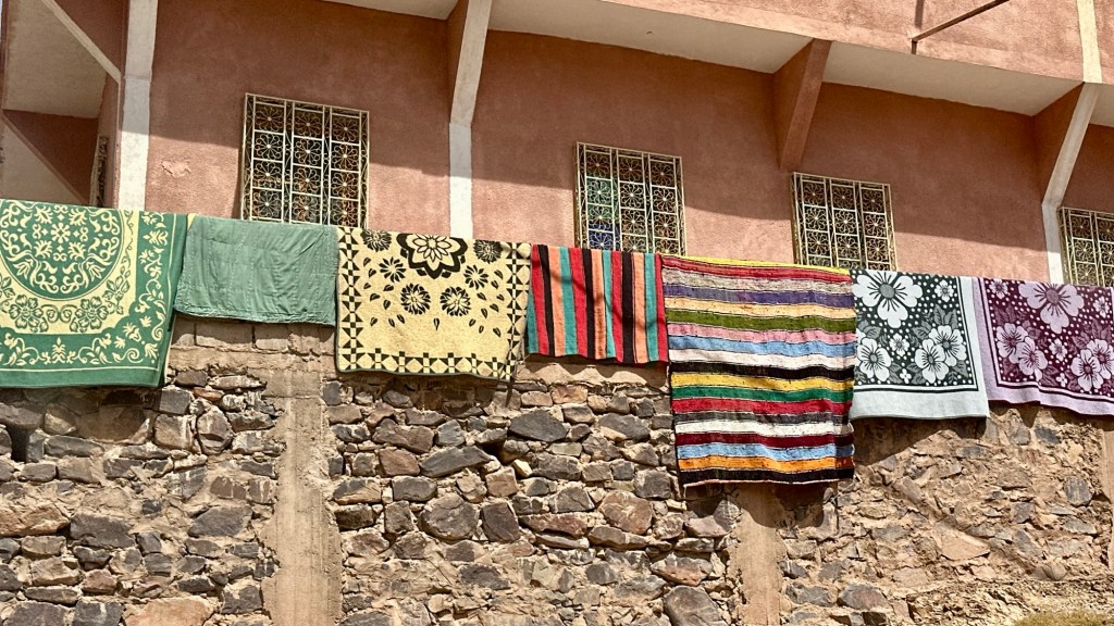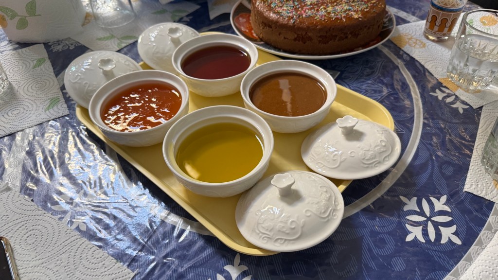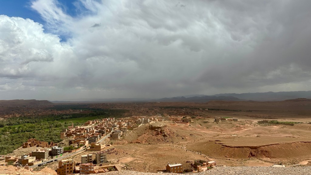 21.3.2025 Am Morgen ziehen wir von unserem Wüstenlager um auf den nahe gelegenen Campingplatz „Auberge El Khaima“ in Mhamid, wo wir sogar einen roten Teppich vors Wohnmobil gelegt bekommen. Um 10 h startet eine Jeep-Tour (genau genommen eine Toyota-Tour) in die Wüste bei Mhamid el Ghizlane. Wir werden in der endlosen Landschaft insgesamt mehr als 100 km durchgerüttelt und besuchen einige Nomaden. Diese sind auf unseren Besuch bestens vorbereitet. Sie verkaufen Souvenirs, bieten Tee an und zeigen uns ihre interessante Art, mit einfachsten Mitteln Brot zu backen. An den größeren Sanddünen, die wir mittags erreichen, ist alles für ein gutes Essen bereit, und auf dem Rückweg lassen sich dann auch noch die Dromedare bereitwillig fotografieren. Leicht erschöpft und verstaubt vom Tourismusprogramm sind wir gegen 17 h zurück auf dem Campingplatz.22.3.2025 Vormittags fahren wir auf guten Straßen und durch beeindruckende Landschaften knapp 200 km nach Agdz. Dabei führt uns die zweite Hälfte des Weges durch das schöne Draa-Tal mit seinen vielen Dattel-Palmen und kargen Bergen. Wir verbringen auf dem Campingplatz „Maison Tensift“ (mit Oasengarten) einen ruhigen Nachmittag. Nach der Reisebesprechung am frühen Abend gibt es im Restaurant des Platzes eine leckere Tajine, dieses Mal mit Hackfleischbällchen. Manfred überredet noch einen marokkanischen Bediensteten dazu, uns eine Flasche Weißwein zu besorgen … der Preis war allerdings mit „Ramadan-Zuschlag“ recht hoch. Den kostbaren Tropfen genießen wir zu sechst diskret in unserem Wohnmobil.„Buttered Camel with Biryani“„Nougat Frozen Candied Fruit Almond“23.3.2025 Insgesamt fahren wir heute 150 km durch die Berglandschaft. In Taznakht machen wir Halt, um etwas über die Teppichproduktion in Marokko zu erfahren … natürlich inklusive Kaufgelegenheit (die wir aber nicht nutzen). Mit schönen Blicken auf die schneebedeckten Berge des Hohen Atlas geht es anschließend weiter nach Ait Ben Haddou, wo wir bei starkem Wind Quartier auf einem einfachen Stellplatz beziehen. Am Nachmittag besichtigen wir das hiesige Lehmdorf, das als Unesco-Weltkulturerbe ein touristischer Hotspot in Marokko ist. Der Wind mausert sich zum Sturm, der Sandwolken durch die Landschaft treibt und unsere Besichtigung etwas ungemütlich macht. Den stürmischen Abend verbringen wir in der inzwischen etablierten Sechserrunde (mit Angelika, Andreas, Sigrid und Gerd) im Restaurant „Tanmirt“, wo wir das bisher mit Abstand beste Essen dieser Reise bekommen!24.3.2025 Parallel zur schneebedeckten Bergkette des Hohen Atlas fahren wir 160 km in die Dades-Schlucht, vorbei an kunstvoll beladenen Lkw und Minaretten mit Storchennestern. In der beeindruckenden Schlucht gibt es viele Hotels und Campingplätze, und unsere Gruppe bekommt ein Quartier am „Hotel Majorel“ mit bester Aussicht. Am Nachmittag wandern wir durch die wunderbar grüne Talsohle und erkunden den Canyon eines trockenen Nebenarms des Dades. Vom Wohnmobil aus haben wir einen wunderbaren Blick auf die sonnenbeschienenen Berge. Es wird ein schöner Abend bei unseren Nachbarn, deren Weinvorräte unerschöpflich sind. Das alles wird nur getrübt dadurch, dass Dagmar beim Zurückgehen einen der vorm Nachbar-WoMo abgestellten Schuhe vermisst …25.3.2025 In der Nacht ist es windig und kalt (wir sind auf 1670 m Höhe), es regnet und gewittert sogar. Am Morgen scheint dann aber wieder die Sonne, und Dagmar kann auch gleich den Schuhklau-Übeltäter samt seiner Beute stellen. Wir beschließen, für die weitere Erkundung der Dades-Schlucht unser Wohnmobil zu schonen und stattdessen mit den eBikes zu fahren. Bei mäßigem Autoverkehr radeln wir auch die wunderbaren Serpentinen hinauf und genießen die Aussicht. Noch etwas weiter im Tal (nach 16 km) erreichen wir die engste Stelle, an der sich größere Fahrzeuge aneinander vorbei mühen. Auf dem Rückweg genießen wir marokkanischen Pfefferminztee und bekommen auch eine Tajine mit Gemüse und Ei als spätes Frühstück. Zurück am Wohnmobil geht es dann nur gut 70 km weiter in die Todra-Schlucht, wo unsere Gruppe einmal mehr auf dem „Auberge Camping Atlas“ unter Palmen steht.26.3.2025 Heute ist „Ruhetag“, und wir fahren nicht weiter. Der Pool des Stellplatzes wirkt in der Sonne zwar verlockend, aber es sind trotzdem nur 15 Grad Lufttemperatur. Nach umfassender Abwägung verzichten wir auf das kühle Bad. Stattdessen queren wir zu Fuß das Flüsschen Todra, um dort den Oasengarten mit seinen Wasserrinnen, Dattelpalmen und etwas Landwirtschaft zu erkunden. Nachmittags machen wir noch eine kleine Radtour. Nur gut 5 km entfernt befindet sich die bekannte Engstelle der Todra-Schlucht mit bis zu 300 m hohen Steilwänden … ein Paradies für Kletterer.27.3.2025 Bereits um halb neun starten wir unsere Fahrt über gut 200 km in Richtung Erg Chebbi. Erster Halt ist das Berber-Museum in Tinejdad, wo wir viel über die Berber-Kultur erfahren. Dort gibt es auch Erklärungen zu den Khettaras, die wir uns beim zweiten Stopp ansehen. Es sind unterirdische Wasserkanäle, mit denen die Grundwasserschicht „angezapft“ wurde und dann das Wasser mit geringem Gefälle in Richtung einer Talsohle bis zur Oberfläche geleitet wurde. „Maulwurfshügel“ an der Oberfläche lassen den Verlauf gut erkennen. Nach einer Wüstenpizza und einem Dattel-Großeinkauf in Rissani fahren wir (ausnahmsweise im Konvoi) zum Hotel „Nomad Palace“ in Merzouga. Wir sind dort nah an den Sanddünen und lassen uns auf einen Dromedarritt ein. Mit sanftem Geschaukel geht es in die Dünen, um dort den Sonnenuntergang zu beobachten. Auch wenn das hier alles sehr „touristifiziert“ ist: Wir haben viel Spaß, und es ist ein schönes Erlebnis!28.3.2025 Auf dem Weg über gut 200 km in Ziz-Tal besuchen wir eine Fossilien-Schleiferei. Wir sind von der Auswahl und besonders von den großen Objekten sehr beeindruckt. Vom Stellplatz „Jurassic“ aus macht Dagmar am Nachmittag eine Wande