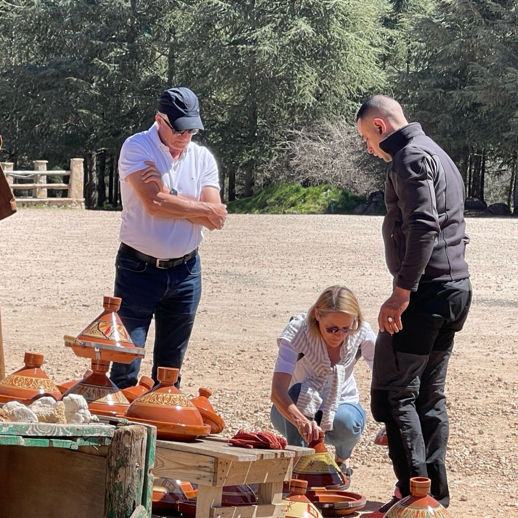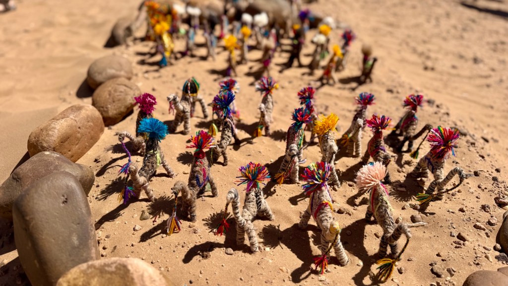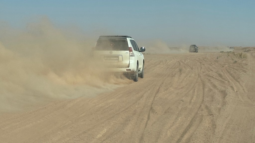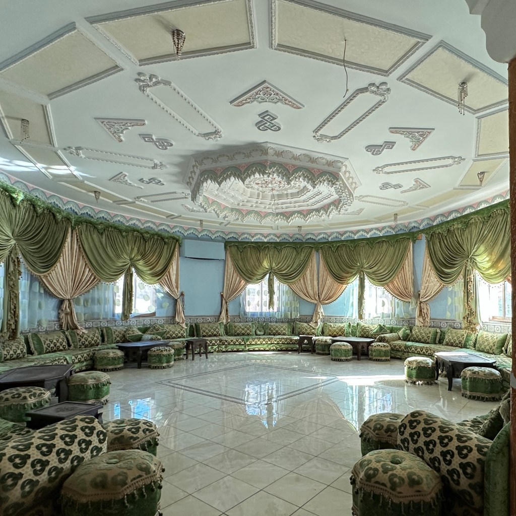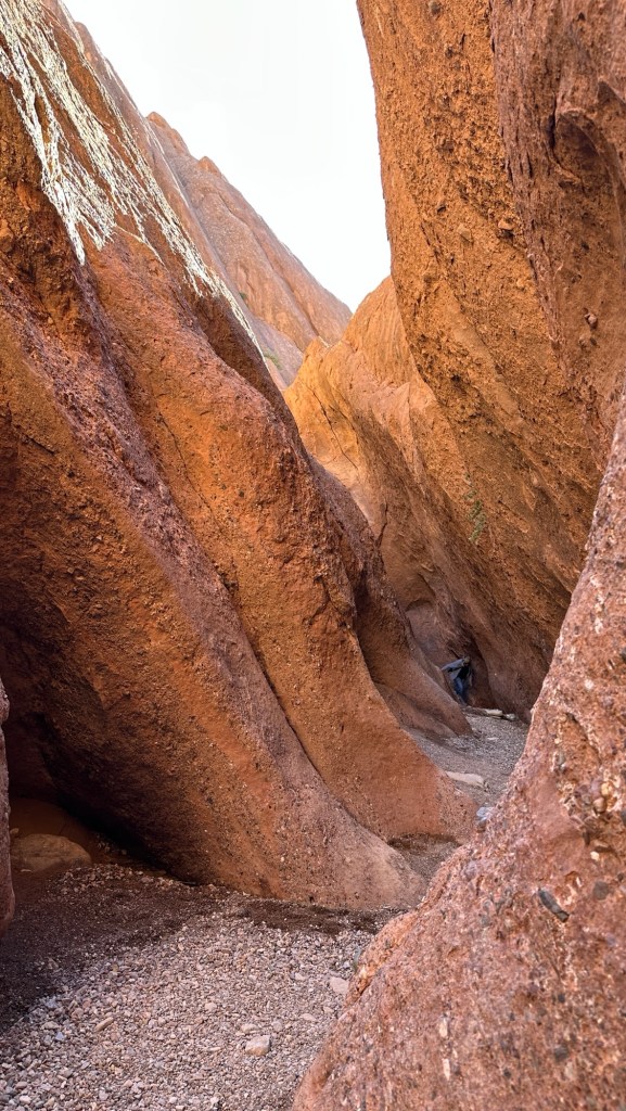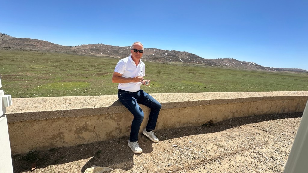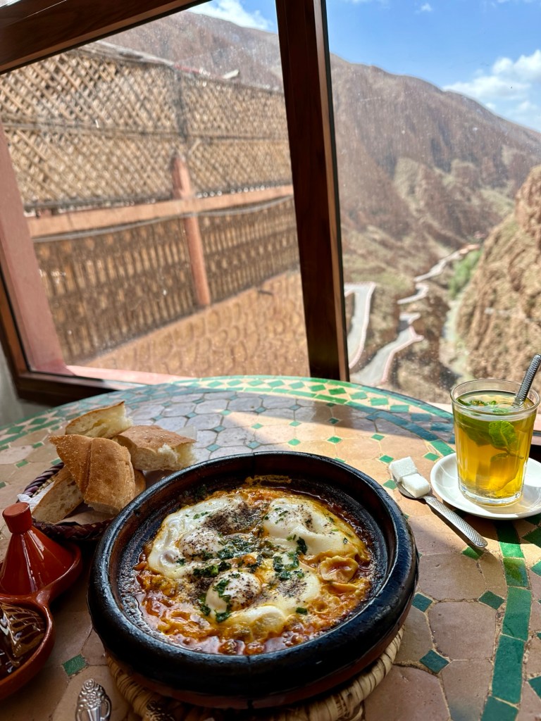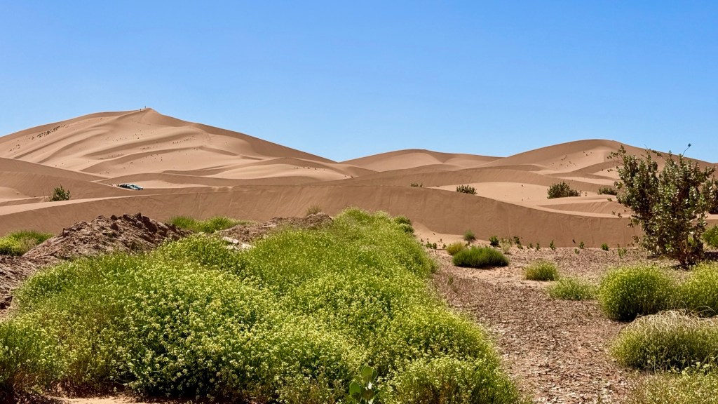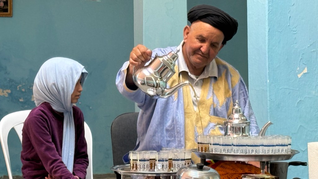 21.3.2025 Am Morgen ziehen wir von unserem Wüstenlager um auf den nahe gelegenen Campingplatz „Auberge El Khaima“ in Mhamid, wo wir sogar einen roten Teppich vors Wohnmobil gelegt bekommen. Um 10 h startet eine Jeep-Tour (genau genommen eine Toyota-Tour) in die Wüste bei Mhamid el Ghizlane. Wir werden in der endlosen Landschaft insgesamt mehr als 100 km durchgerüttelt und besuchen einige Nomaden. Diese sind auf unseren Besuch bestens vorbereitet. Sie verkaufen Souvenirs, bieten Tee an und zeigen uns ihre interessante Art, mit einfachsten Mitteln Brot zu backen. An den größeren Sanddünen, die wir mittags erreichen, ist alles für ein gutes Essen bereit, und auf dem Rückweg lassen sich dann auch noch die Dromedare bereitwillig fotografieren. Leicht erschöpft und verstaubt vom Tourismusprogramm sind wir gegen 17 h zurück auf dem Campingplatz.22.3.2025 Vormittags fahren wir auf guten Straßen und durch beeindruckende Landschaften knapp 200 km nach Agdz. Dabei führt uns die zweite Hälfte des Weges durch das schöne Draa-Tal mit seinen vielen Dattel-Palmen und kargen Bergen. Wir verbringen auf dem Campingplatz „Maison Tensift“ (mit Oasengarten) einen ruhigen Nachmittag. Nach der Reisebesprechung am frühen Abend gibt es im Restaurant des Platzes eine leckere Tajine, dieses Mal mit Hackfleischbällchen. Manfred überredet noch einen marokkanischen Bediensteten dazu, uns eine Flasche Weißwein zu besorgen … der Preis war allerdings mit „Ramadan-Zuschlag“ recht hoch. Den kostbaren Tropfen genießen wir zu sechst diskret in unserem Wohnmobil.„Buttered Camel with Biryani“„Nougat Frozen Candied Fruit Almond“23.3.2025 Insgesamt fahren wir heute 150 km durch die Berglandschaft. In Taznakht machen wir Halt, um etwas über die Teppichproduktion in Marokko zu erfahren … natürlich inklusive Kaufgelegenheit (die wir aber nicht nutzen). Mit schönen Blicken auf die schneebedeckten Berge des Hohen Atlas geht es anschließend weiter nach Ait Ben Haddou, wo wir bei starkem Wind Quartier auf einem einfachen Stellplatz beziehen. Am Nachmittag besichtigen wir das hiesige Lehmdorf, das als Unesco-Weltkulturerbe ein touristischer Hotspot in Marokko ist. Der Wind mausert sich zum Sturm, der Sandwolken durch die Landschaft treibt und unsere Besichtigung etwas ungemütlich macht. Den stürmischen Abend verbringen wir in der inzwischen etablierten Sechserrunde (mit Angelika, Andreas, Sigrid und Gerd) im Restaurant „Tanmirt“, wo wir das bisher mit Abstand beste Essen dieser Reise bekommen!24.3.2025 Parallel zur schneebedeckten Bergkette des Hohen Atlas fahren wir 160 km in die Dades-Schlucht, vorbei an kunstvoll beladenen Lkw und Minaretten mit Storchennestern. In der beeindruckenden Schlucht gibt es viele Hotels und Campingplätze, und unsere Gruppe bekommt ein Quartier am „Hotel Majorel“ mit bester Aussicht. Am Nachmittag wandern wir durch die wunderbar grüne Talsohle und erkunden den Canyon eines trockenen Nebenarms des Dades. Vom Wohnmobil aus haben wir einen wunderbaren Blick auf die sonnenbeschienenen Berge. Es wird ein schöner Abend bei unseren Nachbarn, deren Weinvorräte unerschöpflich sind. Das alles wird nur getrübt dadurch, dass Dagmar beim Zurückgehen einen der vorm Nachbar-WoMo abgestellten Schuhe vermisst …25.3.2025 In der Nacht ist es windig und kalt (wir sind auf 1670 m Höhe), es regnet und gewittert sogar. Am Morgen scheint dann aber wieder die Sonne, und Dagmar kann auch gleich den Schuhklau-Übeltäter samt seiner Beute stellen. Wir beschließen, für die weitere Erkundung der Dades-Schlucht unser Wohnmobil zu schonen und stattdessen mit den eBikes zu fahren. Bei mäßigem Autoverkehr radeln wir auch die wunderbaren Serpentinen hinauf und genießen die Aussicht. Noch etwas weiter im Tal (nach 16 km) erreichen wir die engste Stelle, an der sich größere Fahrzeuge aneinander vorbei mühen. Auf dem Rückweg genießen wir marokkanischen Pfefferminztee und bekommen auch eine Tajine mit Gemüse und Ei als spätes Frühstück. Zurück am Wohnmobil geht es dann nur gut 70 km weiter in die Todra-Schlucht, wo unsere Gruppe einmal mehr auf dem „Auberge Camping Atlas“ unter Palmen steht.26.3.2025 Heute ist „Ruhetag“, und wir fahren nicht weiter. Der Pool des Stellplatzes wirkt in der Sonne zwar verlockend, aber es sind trotzdem nur 15 Grad Lufttemperatur. Nach umfassender Abwägung verzichten wir auf das kühle Bad. Stattdessen queren wir zu Fuß das Flüsschen Todra, um dort den Oasengarten mit seinen Wasserrinnen, Dattelpalmen und etwas Landwirtschaft zu erkunden. Nachmittags machen wir noch eine kleine Radtour. Nur gut 5 km entfernt befindet sich die bekannte Engstelle der Todra-Schlucht mit bis zu 300 m hohen Steilwänden … ein Paradies für Kletterer.27.3.2025 Bereits um halb neun starten wir unsere Fahrt über gut 200 km in Richtung Erg Chebbi. Erster Halt ist das Berber-Museum in Tinejdad, wo wir viel über die Berber-Kultur erfahren. Dort gibt es auch Erklärungen zu den Khettaras, die wir uns beim zweiten Stopp ansehen. Es sind unterirdische Wasserkanäle, mit denen die Grundwasserschicht „angezapft“ wurde und dann das Wasser mit geringem Gefälle in Richtung einer Talsohle bis zur Oberfläche geleitet wurde. „Maulwurfshügel“ an der Oberfläche lassen den Verlauf gut erkennen. Nach einer Wüstenpizza und einem Dattel-Großeinkauf in Rissani fahren wir (ausnahmsweise im Konvoi) zum Hotel „Nomad Palace“ in Merzouga. Wir sind dort nah an den Sanddünen und lassen uns auf einen Dromedarritt ein. Mit sanftem Geschaukel geht es in die Dünen, um dort den Sonnenuntergang zu beobachten. Auch wenn das hier alles sehr „touristifiziert“ ist: Wir haben viel Spaß, und es ist ein schönes Erlebnis!28.3.2025 Auf dem Weg über gut 200 km in Ziz-Tal besuchen wir eine Fossilien-Schleiferei. Wir sind von der Auswahl und besonders von den großen Objekten sehr beeindruckt. Vom Stellplatz „Jurassic“ aus macht Dagmar am Nachmittag eine Wande