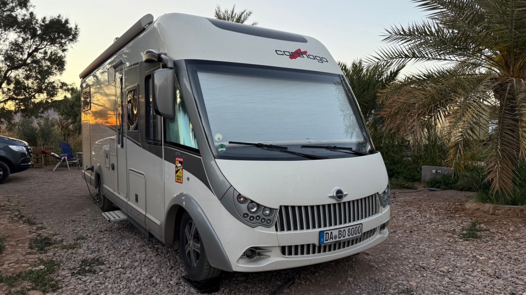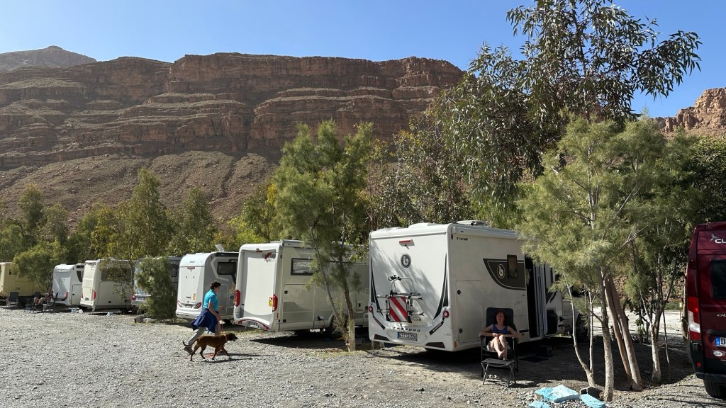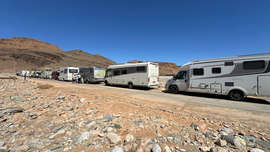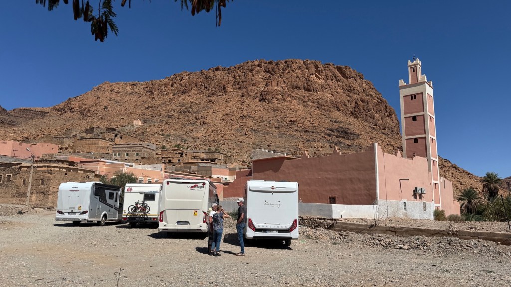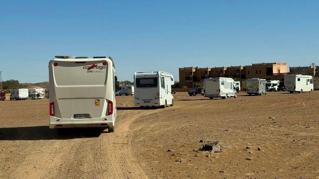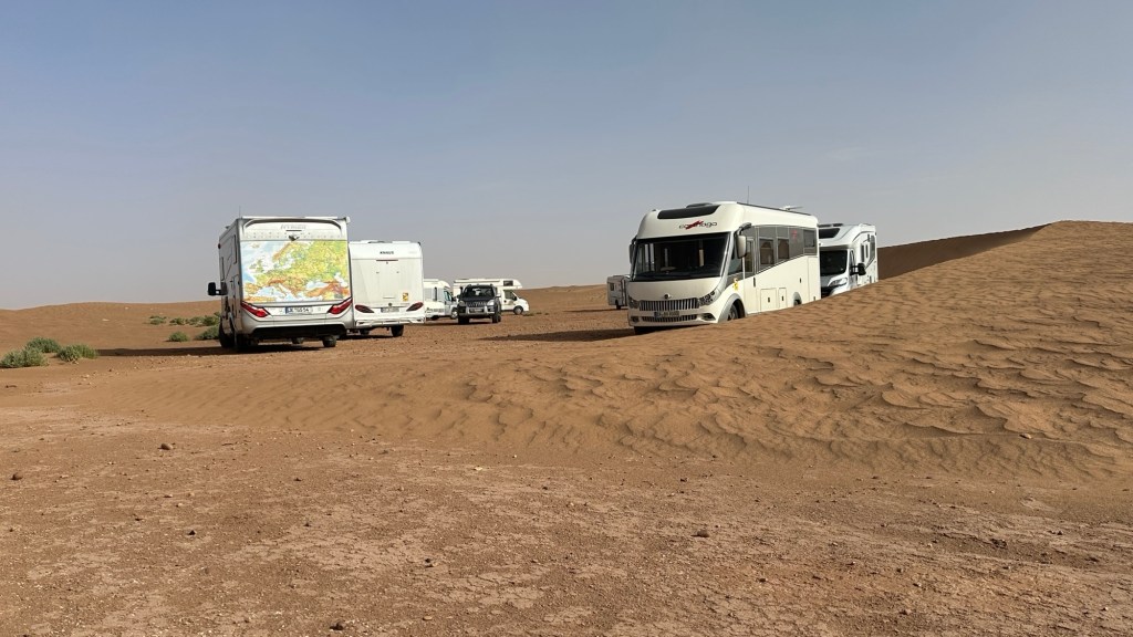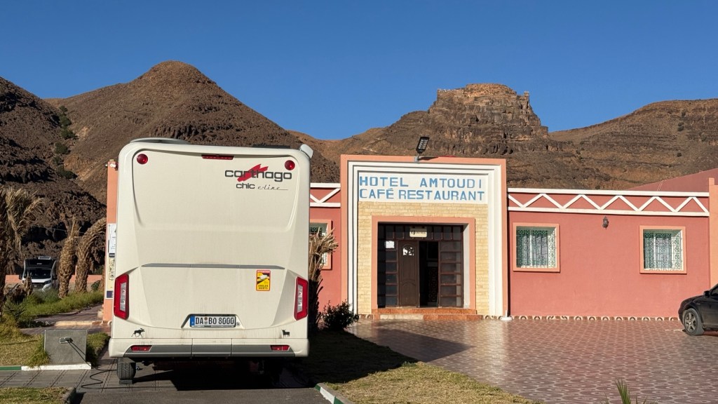 16.3.2025 Um 9 h starten wir unsere Fahrt von Tafraout nach Amtoudi. Nach 40 km ist plötzlich die Straße wegen eines Felsrutsches gesperrt. Nach einiger Konsultation mit Mitreisenden und Reiseleitung nehmen wir dann den Umweg über Tiznit, und so werden aus den eigentlich 138 km nun 202 km Fahrt. Nach gut 4 Stunden schönem Landschaftskino kommen wir im Berberdorf Amtoudi an. Während Manfred sich von der Fahrt erholt, startet Dagmar gleich nach der Ankunft in eine dreistündige staubige Wanderung durch eine spektakuläre Canyon-Landschaft und zu den Quellen, die diese ansonsten karge Umgebung etwas fruchtbar machen.17.3.2025 Ab 9:30 h ist Cardio-Training angesagt: Wir steigen hinauf zur 200 m über uns liegenden Speicherburg, in der bis in die 1950er Jahre hinein Berberfamilien aus der Umgebung ihr Hab und Gut sicher einlagern konnten. Nach dem Mittagessen fahren wir etwa 60 km zum südlichsten Punkt unserer Reise. Die Wohnmobile unserer Gruppe treffen sich in einem ausgetrockneten Flussbett, um gemeinsam auf den Übernachtungsplatz beim Dorf Imi Ouzlag zu rollen. Der Reiseveranstalter hat dort den Besuch von Hassan organisiert, in dessen Haus wir mit einem Tee und einigen Leckereien begrüßt werden. Die Einfachheit des Hauses und seiner Ausstattung machen die Situation der Berber hier sehr deutlich. Dagmar lässt sich von Hassans Nachbarin ein hübsches Henna-Tatoo auf den Arm malen, während Manfred die LNB der Sat-Schüssel um 23 Grad verdreht, damit wir mal wieder Astra empfangen und Nachrichten schauen können. Es folgt ein Rundgang durch den Oasengarten der 50-köpfigen Dorfgemeinschaft und dann ein leckeres Abendessen mit Couscous im Haus von Hassan.18.3.2025 Der erste Teil der Strecke ins knapp 200 km entfernte Tata ist etwas holprig, aber dann können wir zügig durch die weite, menschenleere Landschaft fahren. Dromedar-Warnschilder haben hier wohl ihre Berechtigung, und Manfred staunt über den bei Tata kilometerlang angelegten Radweg. Wir kommen mittags auf dem komfortablen Stellplatz „Palmier“ an. Es ist Halbzeit unserer Tour und ein bisschen Putzen angesagt. Abends feiern wir das Bergfest in der Gruppe. Das Fleisch auf dem Grill besorgt der Veranstalter, und jeder bringt etwas fürs Beilagenbuffet mit. Wir sind bis hierher mit unserer Tour sehr zufrieden und freuen uns auf die zweite Hälfte der Reise!19.3.2025 Es geht wieder über sehr gute Nationalstraßen ins 140 km entfernte Foum Zguid (Camping Khayma). Wir machen unterwegs Halt an einem Fluss, der einen tiefen Canyon gebildet hat. Den Nachmittag verbringen wir unter Palmen am Wohnmobil, abends gibt es noch ein Tajine-Essen.Foto: Gerd K.20.3.2025 Wir fahren morgens auf guten Straßen weiter durch weite Landschaft … über 100 km gibt es hier keine einzige Ortschaft. In Tamegroute führt uns Abdul durch den sehr ärmlichen Ort, zu einer alten Bibliothek und in eine Töpferei, die noch immer nach einfachsten Methoden arbeitet. Geschäfte bieten die vielfältigen Produkte an, die aber durchweg recht grob und wenig sorgfältig bearbeitet sind. Nach nochmal einer Stunde Fahrt fahren wir kurz vor Mhamid mit der ganzen Reisegruppe in die Sandwüste. Zunächst fegt uns der starke Wind den Sand durch alle Ritzen ins Wohnmobil. Später lässt der Wind zum Glück nach, und wir können die Wüste und den Sternenhimmel an einem Lagerfeuer und mit moderner Berbermusik rundherum genießen!