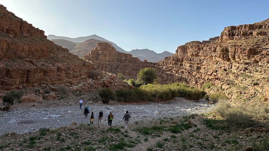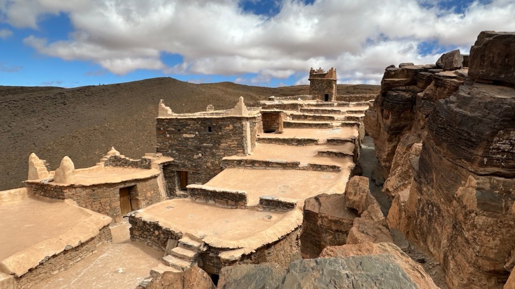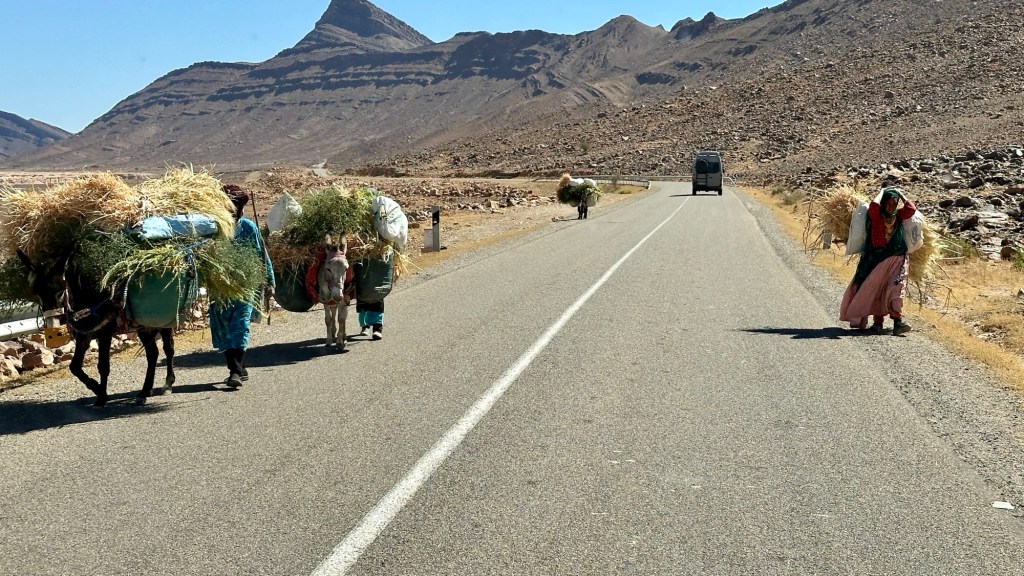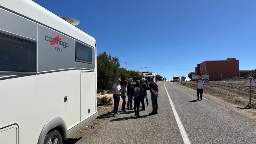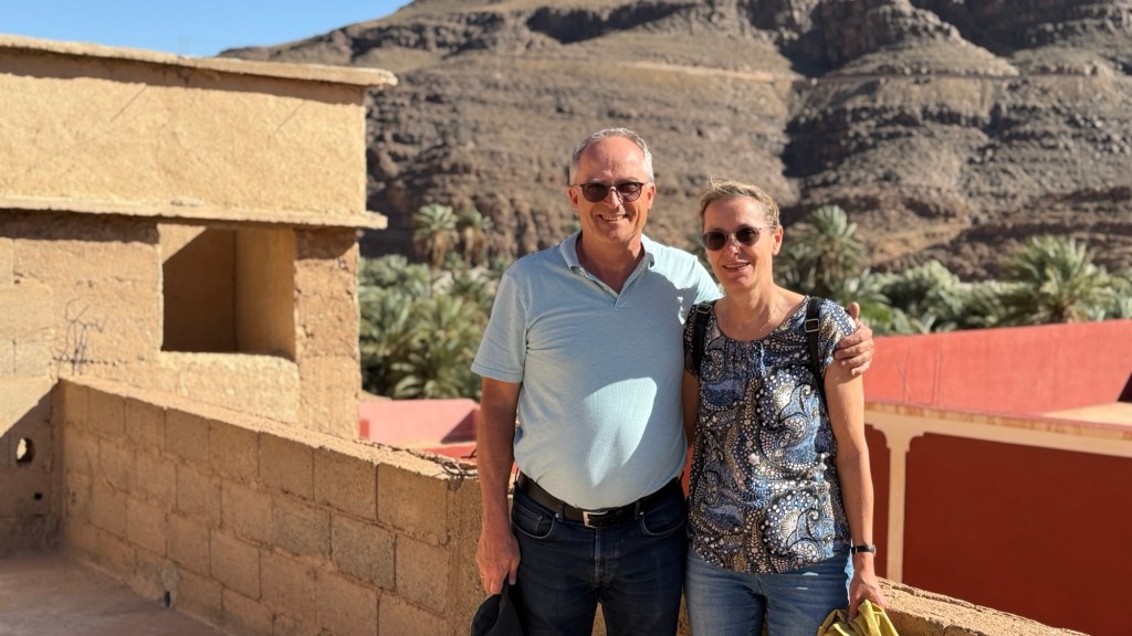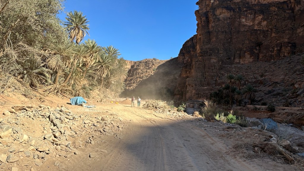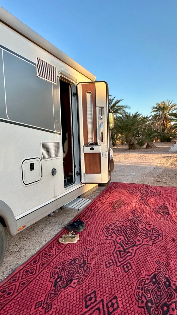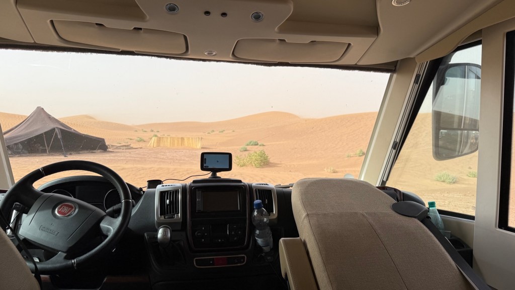 16.3.2025 Um 9 h starten wir unsere Fahrt von Tafraout nach Amtoudi. Nach 40 km ist plötzlich die Straße wegen eines Felsrutsches gesperrt. Nach einiger Konsultation mit Mitreisenden und Reiseleitung nehmen wir dann den Umweg über Tiznit, und so werden aus den eigentlich 138 km nun 202 km Fahrt. Nach gut 4 Stunden schönem Landschaftskino kommen wir im Berberdorf Amtoudi an. Während Manfred sich von der Fahrt erholt, startet Dagmar gleich nach der Ankunft in eine dreistündige staubige Wanderung durch eine spektakuläre Canyon-Landschaft und zu den Quellen, die diese ansonsten karge Umgebung etwas fruchtbar machen.17.3.2025 Ab 9:30 h ist Cardio-Training angesagt: Wir steigen hinauf zur 200 m über uns liegenden Speicherburg, in der bis in die 1950er Jahre hinein Berberfamilien aus der Umgebung ihr Hab und Gut sicher einlagern konnten. Nach dem Mittagessen fahren wir etwa 60 km zum südlichsten Punkt unserer Reise. Die Wohnmobile unserer Gruppe treffen sich in einem ausgetrockneten Flussbett, um gemeinsam auf den Übernachtungsplatz beim Dorf Imi Ouzlag zu rollen. Der Reiseveranstalter hat dort den Besuch von Hassan organisiert, in dessen Haus wir mit einem Tee und einigen Leckereien begrüßt werden. Die Einfachheit des Hauses und seiner Ausstattung machen die Situation der Berber hier sehr deutlich. Dagmar lässt sich von Hassans Nachbarin ein hübsches Henna-Tatoo auf den Arm malen, während Manfred die LNB der Sat-Schüssel um 23 Grad verdreht, damit wir mal wieder Astra empfangen und Nachrichten schauen können. Es folgt ein Rundgang durch den Oasengarten der 50-köpfigen Dorfgemeinschaft und dann ein leckeres Abendessen mit Couscous im Haus von Hassan.18.3.2025 Der erste Teil der Strecke ins knapp 200 km entfernte Tata ist etwas holprig, aber dann können wir zügig durch die weite, menschenleere Landschaft fahren. Dromedar-Warnschilder haben hier wohl ihre Berechtigung, und Manfred staunt über den bei Tata kilometerlang angelegten Radweg. Wir kommen mittags auf dem komfortablen Stellplatz „Palmier“ an. Es ist Halbzeit unserer Tour und ein bisschen Putzen angesagt. Abends feiern wir das Bergfest in der Gruppe. Das Fleisch auf dem Grill besorgt der Veranstalter, und jeder bringt etwas fürs Beilagenbuffet mit. Wir sind bis hierher mit unserer Tour sehr zufrieden und freuen uns auf die zweite Hälfte der Reise!19.3.2025 Es geht wieder über sehr gute Nationalstraßen ins 140 km entfernte Foum Zguid (Camping Khayma). Wir machen unterwegs Halt an einem Fluss, der einen tiefen Canyon gebildet hat. Den Nachmittag verbringen wir unter Palmen am Wohnmobil, abends gibt es noch ein Tajine-Essen.Foto: Gerd K.20.3.2025 Wir fahren morgens auf guten Straßen weiter durch weite Landschaft … über 100 km gibt es hier keine einzige Ortschaft. In Tamegroute führt uns Abdul durch den sehr ärmlichen Ort, zu einer alten Bibliothek und in eine Töpferei, die noch immer nach einfachsten Methoden arbeitet. Geschäfte bieten die vielfältigen Produkte an, die aber durchweg recht grob und wenig sorgfältig bearbeitet sind. Nach nochmal einer Stunde Fahrt fahren wir kurz vor Mhamid mit der ganzen Reisegruppe in die Sandwüste. Zunächst fegt uns der starke Wind den Sand durch alle Ritzen ins Wohnmobil. Später lässt der Wind zum Glück nach, und wir können die Wüste und den Sternenhimmel an einem Lagerfeuer und mit moderner Berbermusik rundherum genießen!