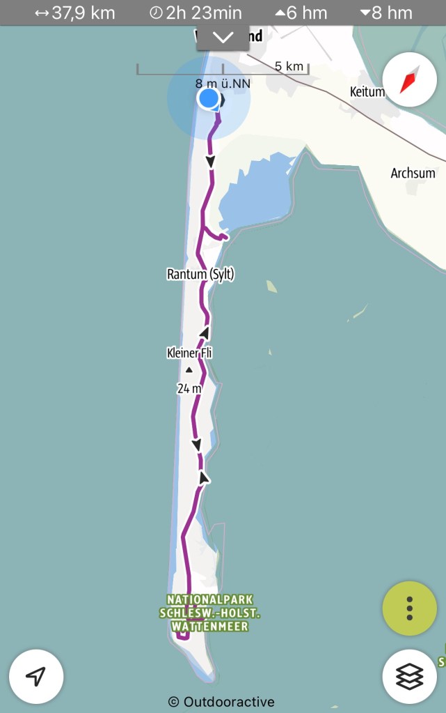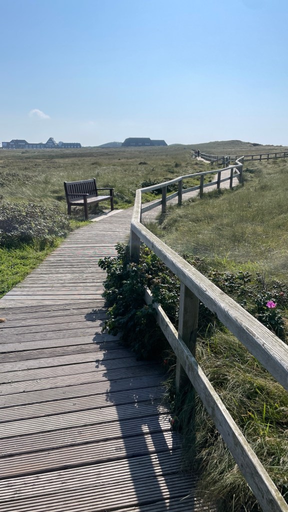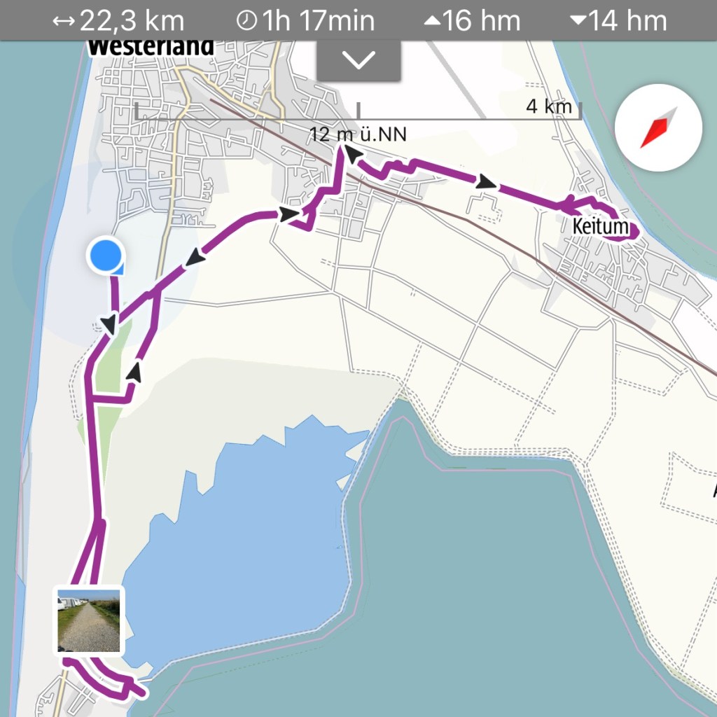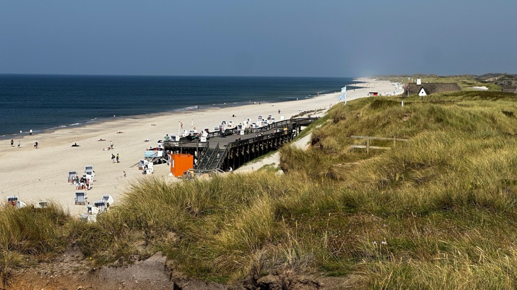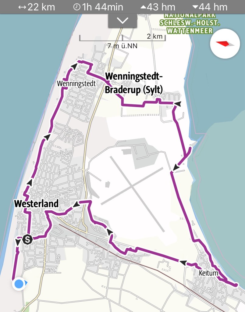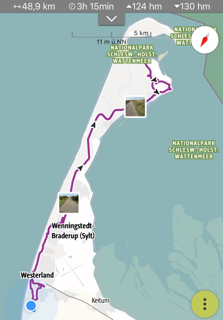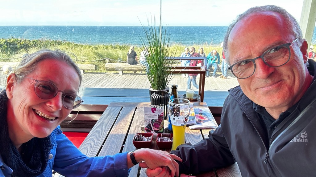 8.9.2024 Auf dem Weg nach Norden machen wir den ersten Stopp an der Weser in Bad Karlshafen. Die Hugenottenstadt hat schöne Architektur, aber der Regen schränkt den Genuss etwas ein. Stattdessen beeindruckt uns auf dem Stellplatz an der Weser ein prächtiger Regenbogen … „Jupiter ascending“.9.9.2024 Wir fahren weiter nach Hannover und verbringen einen sehr schönen Tag mit der Familie … inklusive Spielplatzbesuch.10.9.2024 Durch den Elbtunnel geht es heute nach Schafstedt am Nord-Ostsee-Kanal. Zwischen den Regenschauern machen wir eine Radtour ans Ende des Kanals und zu den Schleusen bei Brunsbüttel.11.9.2024 Nach zwei Stunden Fahrt und einer kleinen Einkaufstour bei einem Rewe-Markt erreichen wir das Nolde-Museum in Neukirchen-Seebüll, unmittelbar an der dänischen Grenze. Das Museum liegt sehr schön in der flachen Landschaft und hat einen bezaubernden Garten. Die Ausstellung mit den Werken des Expressionisten Emil Nolde gefällt uns sehr gut, insbesondere auch deshalb, weil bei aller Wertschätzung für seine Bilder seine Nähe zu den Nationalsozialisten kritisch aufgearbeitet wurde. Am späten Nachmittag fahren wir dann einen kostenfreien Stellplatz am Sportplatz in Neukirchen an. Unsere sehr netten Nachbarn dort sind Darmstädter mit einem Carthago-Wohnmobil. Bei einem Glas Wein haben wir uns viel zu erzählen.12.9.2024 Über die Autoverladung in Niebüll bringt uns der Blaue Autozug über den fast 100 Jahre alten Hindenburgdamm nach Westerland auf Sylt. Leider gibt es selbstverschuldet kleine Blessuren hinten am Wohnmobil (die wir aber dank Sekundenkleber und Panzertape weitgehend unsichtbar machen können). Das Wetter ist mäßig, der vorgebuchte Campingplatz aber sehr gut und nah am Strand gelegen. Am Abend treffen wir unsere Freunde Liane und Michel in der Osteria am Campingplatz. Hier sollten wir natürlich Fisch essen, aber die Spareribs sind trotzdem hervorragend!13.9.2024 Zu viert fahren wir eine kleine Radrunde über Wenningstedt, Braderup und Keitum. Unsere Freunde kennen sich gut aus und zeigen uns, viele Highlights dieser Insel: Wenningstedt mit dem „Gosch“, die „Surferinnen“ von Christel & Laura Lechner, die Kirche St. Severin aus dem 13. Jh., den „Fisch Blum“ in Tinnum (dort essen wir dieses Mal auch wirklich Fisch), die Sylter Schokoladenmanufaktur mit leckerem Kuchen und Einiges mehr. Nach der Radtour treffen wir uns noch auf den SunDowner beim Beach House, und dann ist der Tag auch schon geschafft … 😊😊.14.9.2024 Wir genießen einen ruhigen Tag mit Besuch der Saunalandschaft in der „Sylter Welle“ und gemeinsamem Kochen im Appartment von Liane und Michel am Abend.15.9.2024 Mit dem Auto unserer Freunde erkunden wir den Norden der Insel. Erster kurzer Halt ist in Kampen, wo die Preise den weniger Reichen weniger Vergnügen bereiten. Die Straße „Strönwai“ mit dem Lokal „Pony“, das vor ein paar Wochen durch rechtes Gegröle bekannt wurde, sieht eigentlich ganz normal aus. Eine Golferfigur besticht duch prima Haltung beim Schwung. Danach geht es weiter nach Norden, wo die sehr schöne Dünenlandschaft das Bild von Sylt bestimmt. An der nördlichsten Mautstation Deutschlands (es gibt ja nicht viele) zahlen wir 7 € für die Nutzung der Privatstraße auf den Lister Ellenbogen. Wir genießen das schöne Naturschutzgebiet und werfen einen Blick auf die dänische Nachbarinsel Rømø. Anschließend geht es weiter nach List. Wir essen leckeren Fisch beim Gosch (der Hausherr ist auch grad da), schlendern durch die Tonnenhalle (ohne etwas zu kaufen) und besuchen das „Erlebniszentrum Naturgewalten“ (sehr lehrreich 🧐). Bei der Rückfahrt werfen wir noch einen Blick auf die Wanderdüne Horst.16.9.2024 Bei sehr schönem Wetter machen wir eine Radtour in den Osten der Insel. Entlang dem Wattenmeer und vielen Schafen gelangen wir zum „Morsumer Kliff“. Das gute und erstaunlich preiswerte Mittagessen (einschließlich Quellersalat) gibt es in Morsum im Restaurant „Wie ZuHause“ und den Absacker nach der Radtour in der „Strandoase Sylt“. Die Strandoase ist übrigens Drehort beim Sylt-Krimi „Nord Nord Mord“ S01F04 🧐.17.9.2024 Unseren Hochzeitstag feiern wir zu zweit. Nach gemütlichem Start in den Tag wandern wir am Strand nach Wenningstedt und essen dort beim „Gosch“. Es ist ein sehr schöner, sonniger Tag für uns beide!18.9.2024 Wir grillen ein paar Bratwürste und verbringen den Tag mit Liane und Michel am Wohnmobil. Abends fahren wir mit dem Rad nach Wenningstedt, wo wir den Sonnenuntergang am Restaurant „Gosch“ nicht ganz allein genießen. Die Veranstaltung des Comedian Ray Cay, die wir anschließend besuchen, vergessen wir mal lieber …19.9.2024 Bei bestem Wetter radeln wir durch sehr schöne Landschaft zur Südspitze von Sylt, nach Hörnum. Wir sehen uns am Hafen um, blicken auf die Nachbarinsel Föhr, bewundern die in den Dünen versteckten Häuser, besuchen das Strandlokal „Kap-Horn“ und die Kirche St. Thomas. In dem wirklich sehr schönen Ort Hörnum laufen gerade Filmaufnahmen zu „Nord Nord Mord“. Abends kochen und essen wir gemeinsam bei unseren Freunden.20.9.2024 Morgens ist es sehr feucht und diesig, und wir starten unsere Radtour erst zur Mittagszeit in einen sonnigen Tag hinein. Es geht nach Kampen, erste Station ist das Künstlerkaffee „Kupferkanne“, sehr schön auf der Wattseite gelegen in und auf einer alten Bunkeranlage. Danach fahren wir auf die Seeseite und den wunderbaren Radweg durch die Dünenlandschaft ein gutes Stück Richtung List. Am Abend essen wir nochmal in der Osteria am Campingplatz und verabschieden uns dann von unseren Freunden, die sich morgen auf den Heimweg machen.21.9.2024 Eigentlich wollen wir über den Damm am Rantumbecken fahren, aber der ist wegen der Blauzungenkrankheit der dort weidenden Schafe gesperrt. Auf inzwischen fast vertrauten Wegen fahren wir dann trotzdem zunächst nach Tinnum zum Essen beim „Fisch Blum“ und dann nach Keitum, um dort das Syl